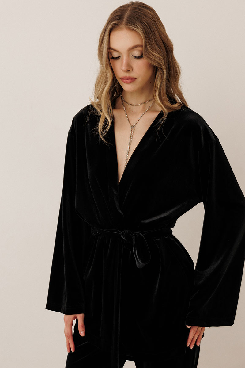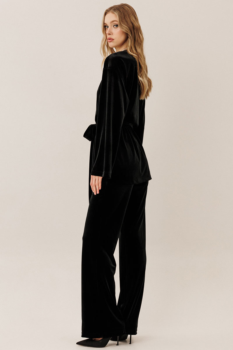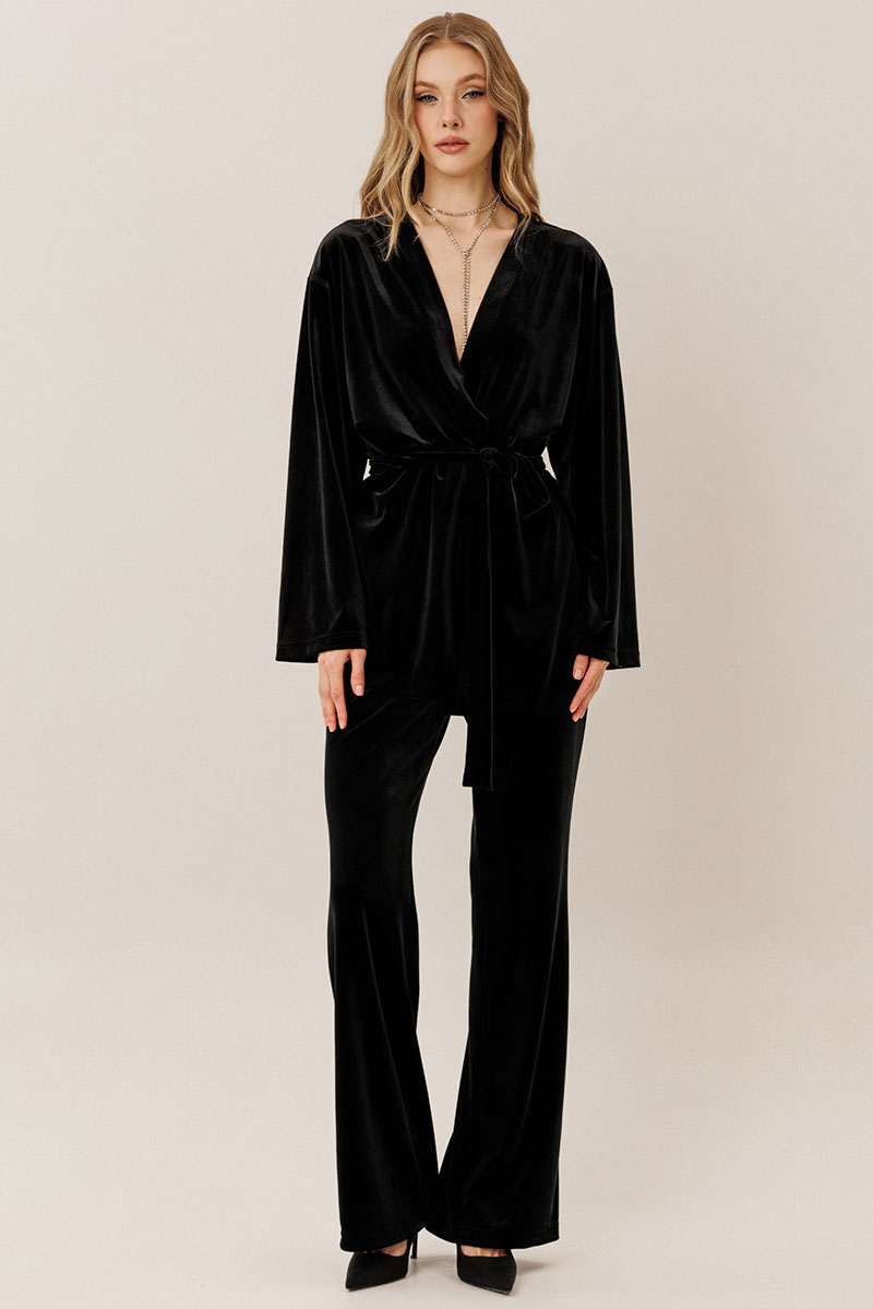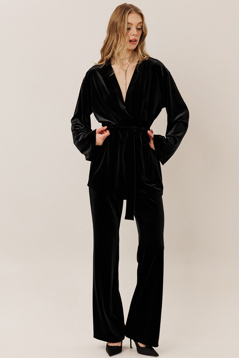 Самый женственный образ в коллекции от GO - нарядный велюровый костюм! Блузон с запахом и брюки клеш - и вы в центре внимания! Будьте стильными вместе с нами!