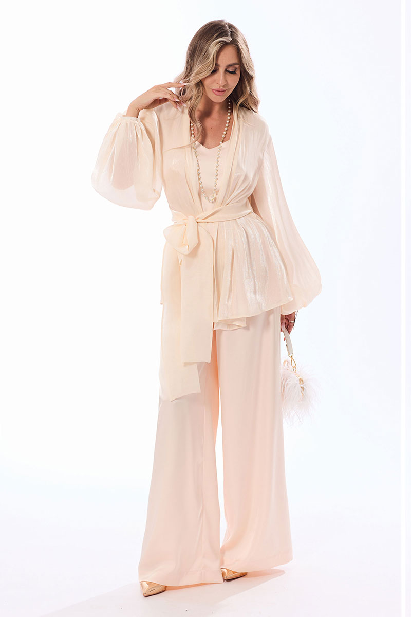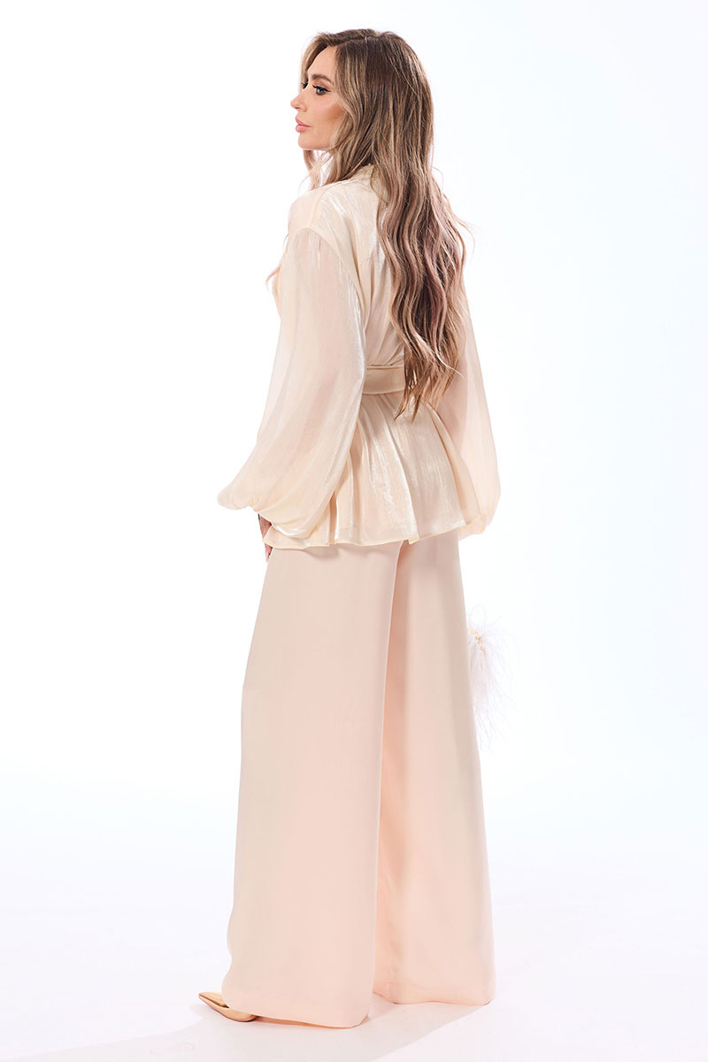 Туника без застежки, с отрезной планкой по борту и горловине спинки. Рукав втачной, длинный, с отрезной манжетой, присборенной на резинку. Туника со съемным поясом, по боковым швам расположены шлевки для пояса.