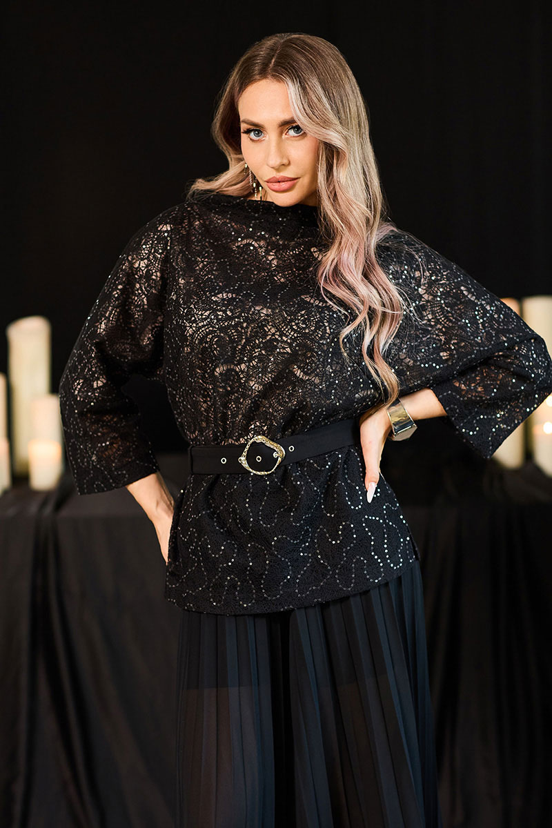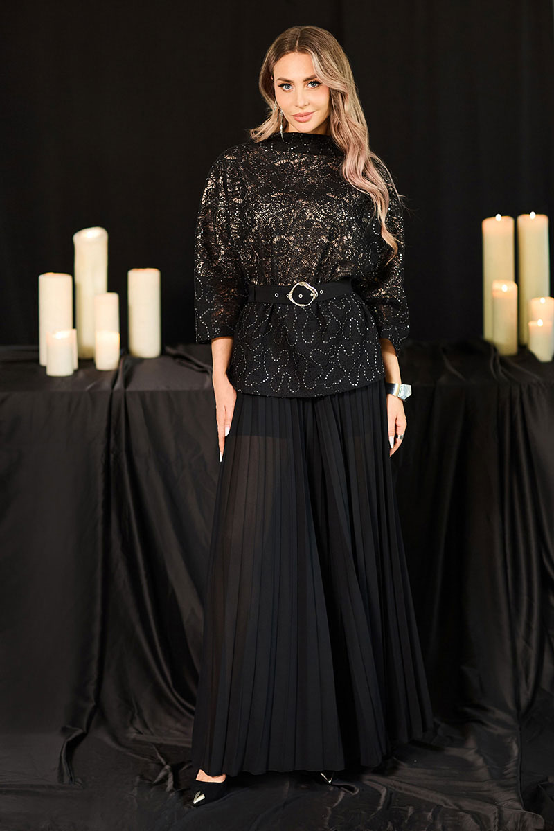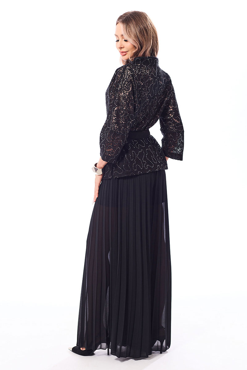 Цветовая гамма для верха, подкладки, фурнитуры, отделки: комплект выполнен из ткани в одной цветовой гамме. Блузка из кружевного полотна на подкладке.