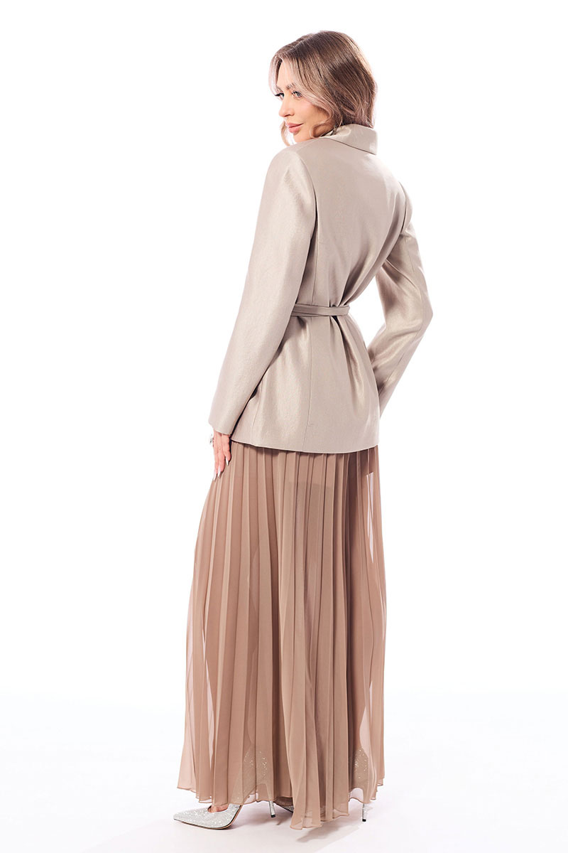 Описание внешнего вида: Жакет с центральной застежкой на петли и пуговицы, втачным воротником и лацканом пиджачного типа. По переду с рельефами, выходящими из проймы и нагрудными вытачками. В рельефных швах расположены карманы. По спинке с рельефами, выходящими из проймы. Жакет со съемной брошью. Рукав втачной, длинный. Брюки- гофре расширенного силуэта, с отрезным поясом, без застежки, верх брюк присборен на резинку. Брюки без боковых швов.