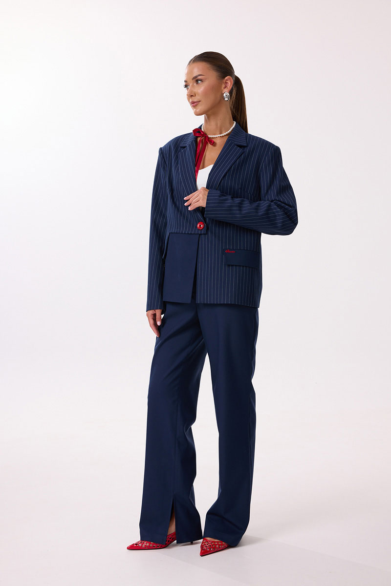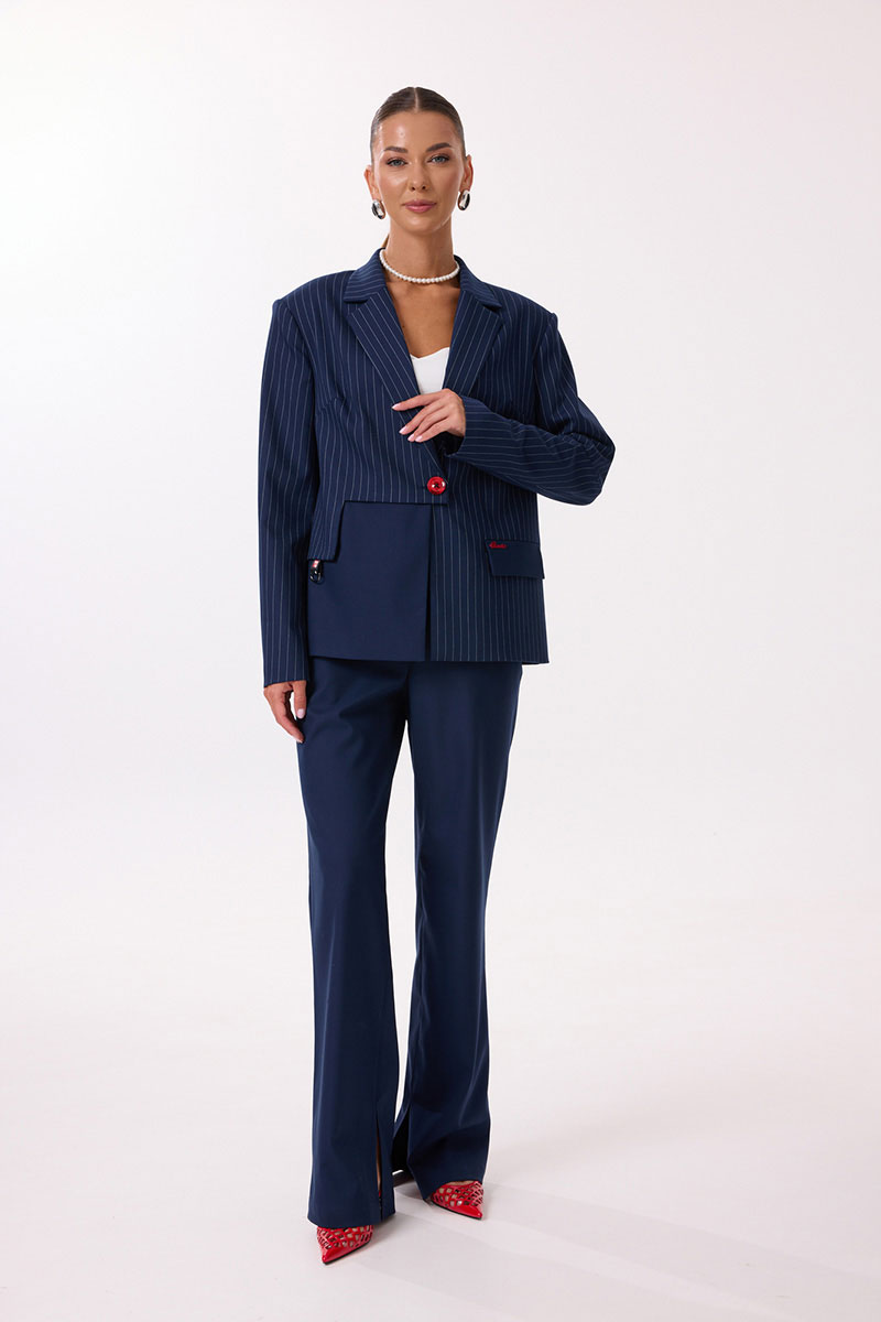 Жакет прямой с центральной бортовой застежкой на петлю и пуговицу. Правая и левая часть переда асимметричны. Правая верхняя часть переда с отлетной асимметричной кокеткой выполнена из основной ткани . Нижняя часть выполнена из ткани-компаньона. Левая часть переда выполнена из основной ткани, прорезной карман с клапаном (декорирован металлическим украшением) и листочкой выполнен из ткани-компаньона. Спинка цельнокроеная. Плечо слегка спущено. Рукав длинный двухшовный. По горловине воротник пиджачного типа.