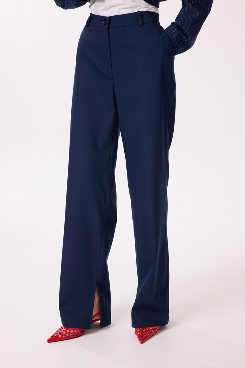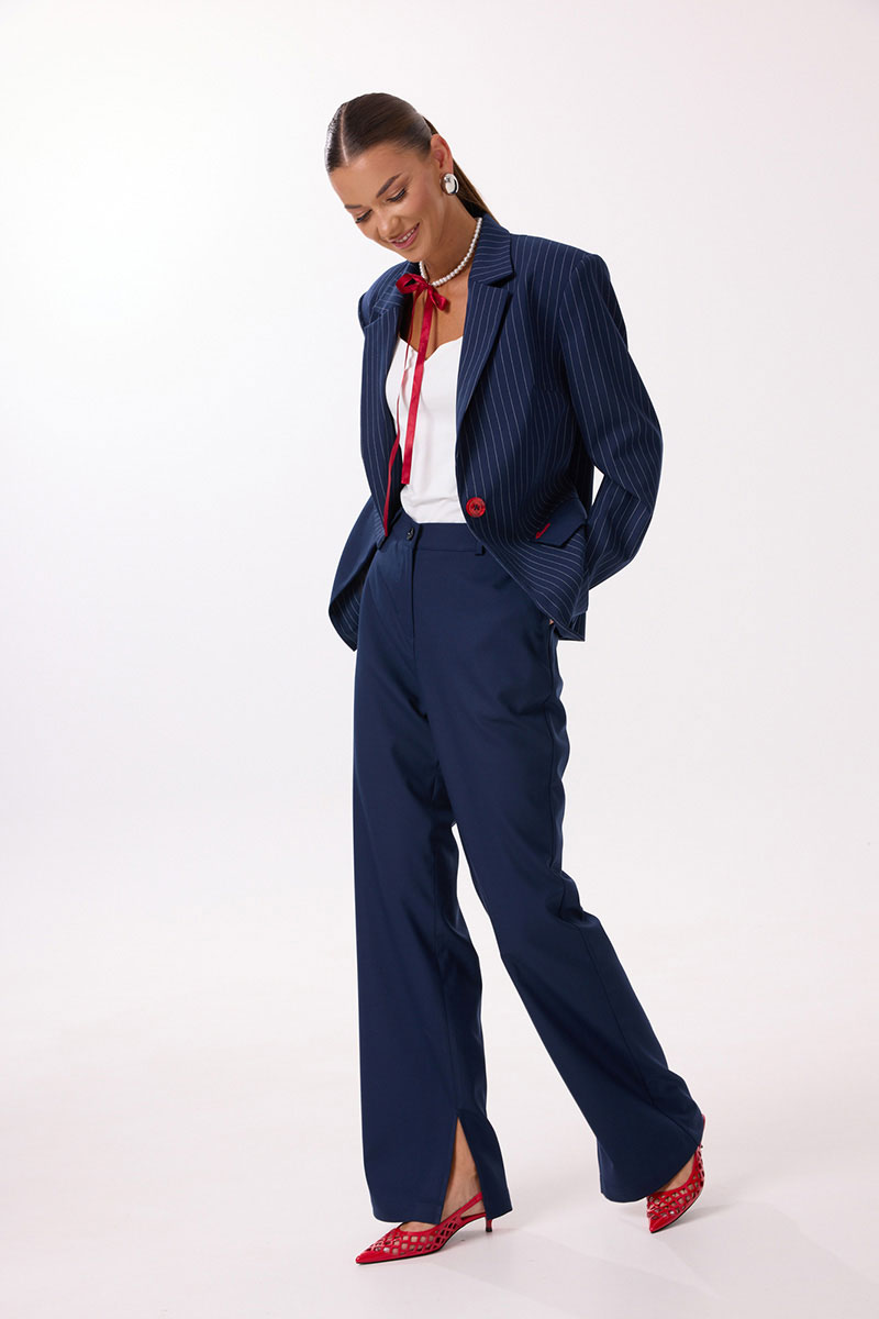 Брюки прямые, выполнены из ткани-компаньона. По переду обработаны карманы с наклонным входом с листочкой, застежка на молнию. По задним половинкам застрочены вытачки. По шаговым срезам брюк расположены разрезы. Верх обработан притачным поясом(частично на резинке), застегивающимся на петлю и пуговицу.