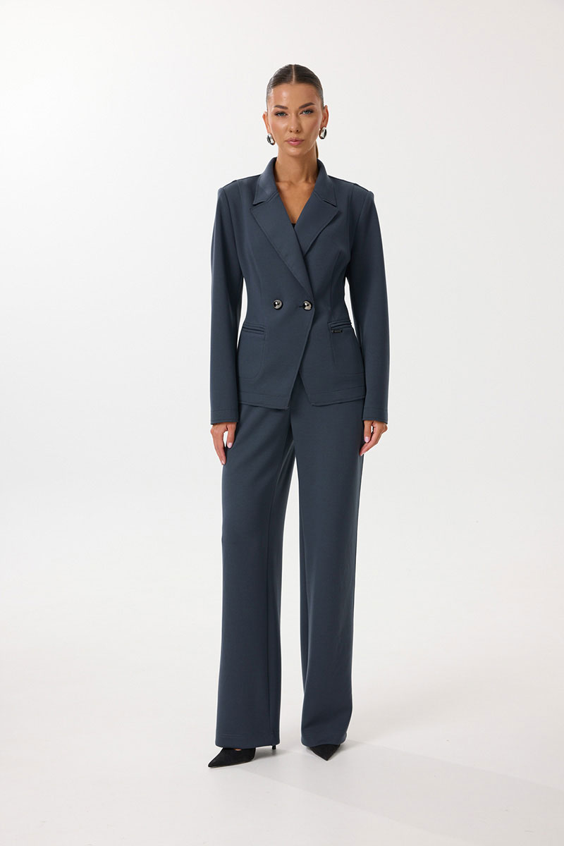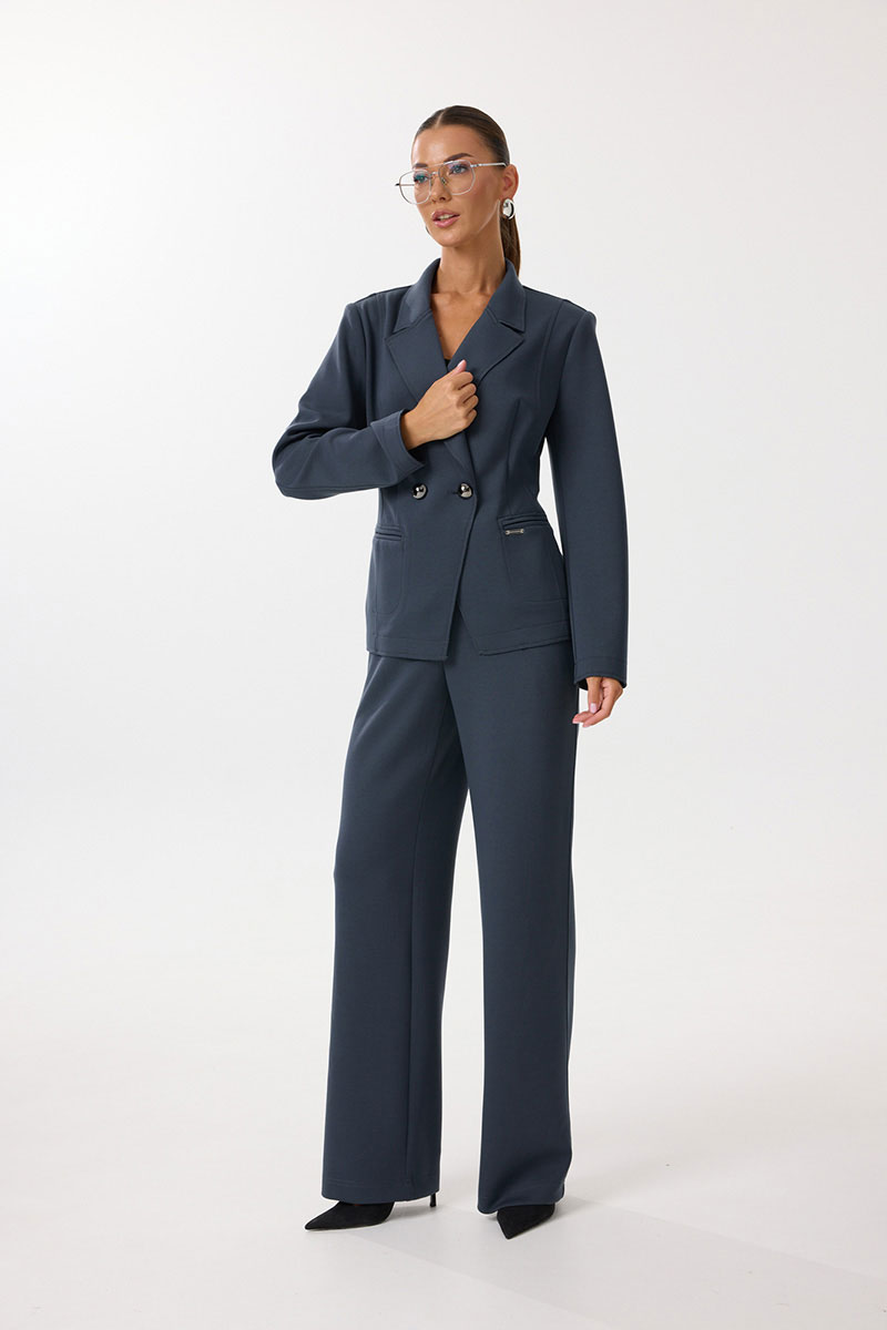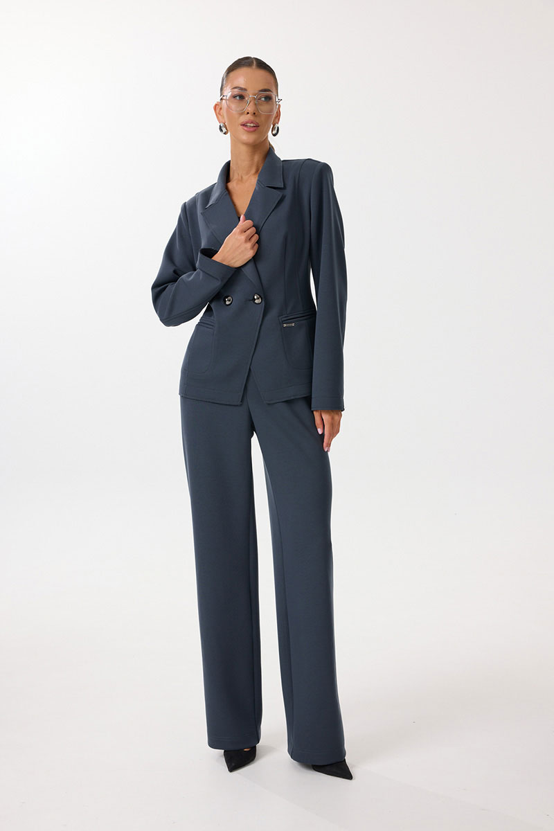 Жакет женский полуприлегающего силуэта с центральной застежкой на петли и пуговицы. По переду обработаны вытачки, рельефы и прорезные отстрочные карманы в рамку. Спинка со средним швом и рельефами. Рукав двухшовный длинный. Горловина обработана воротником пиджачного типа с цельнокроеной стойкой. Низ рукавов и жакета обработаны настрочными планками с изнаночной стороны. Декоративные открытые срезы воротника, борта, низа рукавов и низа изделия отстрочены.