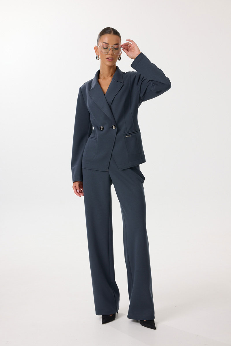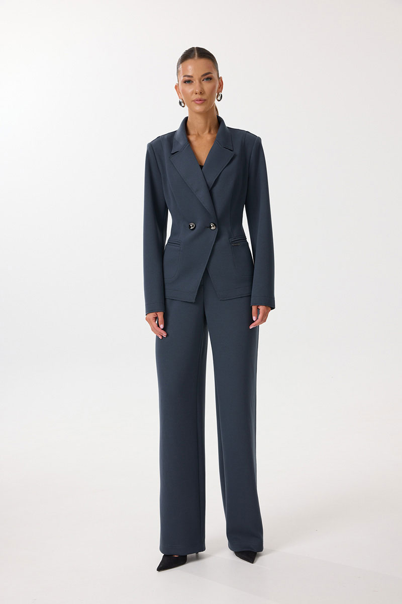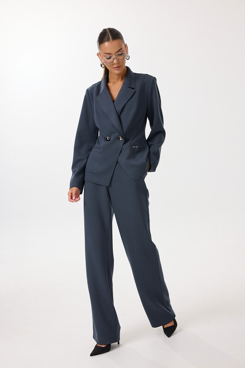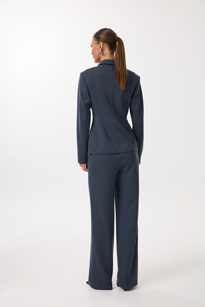 Жакет женский полуприлегающего силуэта с центральной застежкой на петли и пуговицы. По переду обработаны вытачки, рельефы и прорезные отстрочные карманы в рамку. Спинка со средним швом и рельефами. Рукав двухшовный длинный. Горловина обработана воротником пиджачного типа с цельнокроеной стойкой. Низ рукавов и жакета обработаны настрочными планками с изнаночной стороны. Декоративные открытые срезы воротника, борта, низа рукавов и низа изделия отстрочены.