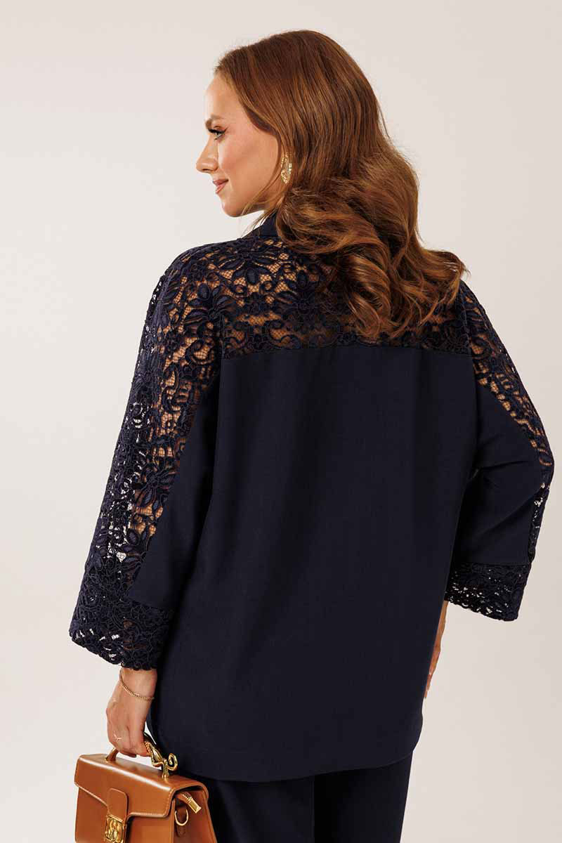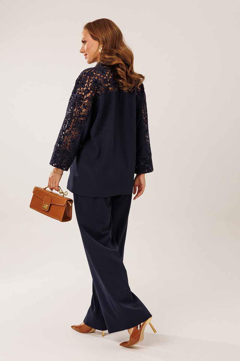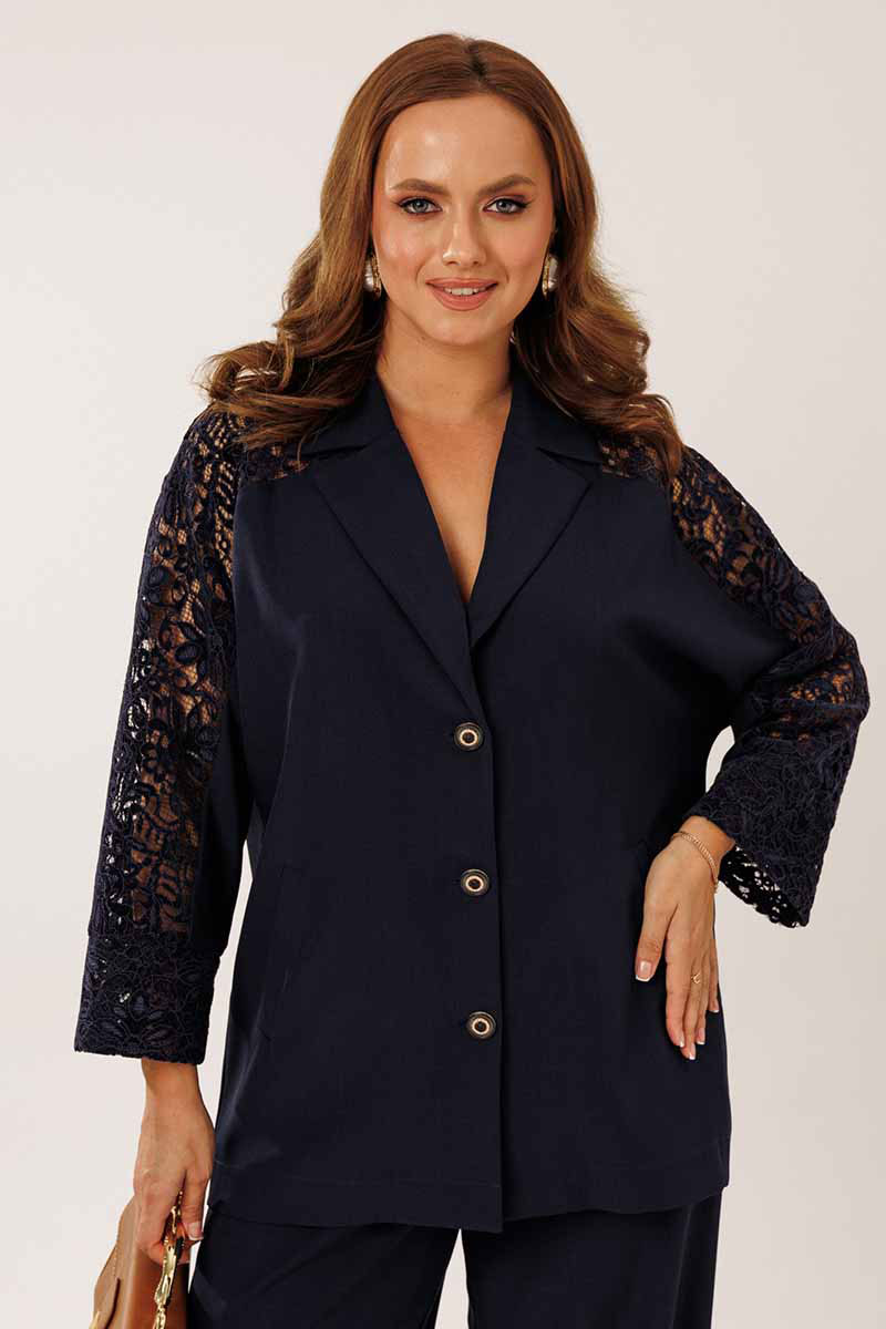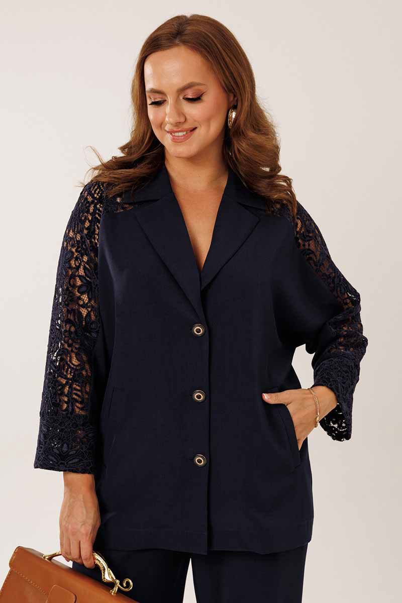 Жакет однобортный без подкладки, прямого силуэта с цельнокроеными рукавами. На полочках жакета обработаны наклонные прирезные карманы «в рамку» с листочкой. Кокетка полочки переходящая в кокетку спинки и верхнюю часть рукава из набивного гипюра в цвет основной ткани жакета. Манжета рукава так же из набивного гипюра. Спинка жакета прямая. Застежка на декоративные петли пуговицы. Горловина обработана втачным воротником с отрезной стойкой и лацканами.