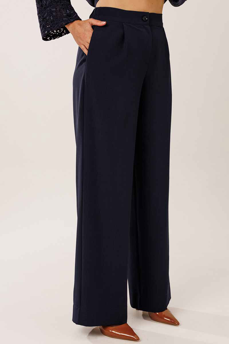Брюки прямого силуэта от бедра с карманами в боковом шве. На передних половинках брюк заложены по 1 складке. По спинке брюк обработаны вытачки. Подгибка низа широкая. Застежка брюк на «молнию» в гульфике. Пояс брюк отрезной с частичной резинкой по спинке брюк.