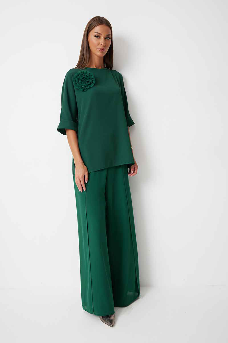 Блуза женская прямого силуэта закрывающая линию паха с цельнокроеными рукавами. К блузке прилагается съёмный декор – цветок. По боковым швам располагаются разрезы. Спинка с центральным швом и застежкой на навесную петлю и пуговицу. Горловина обработана косой бейкой. Рукав до локтя, низ рукава обработан отрезной отворачивающейся манжетой, закрепленной по швам. Низ блузки обработан швом «в подгибку».