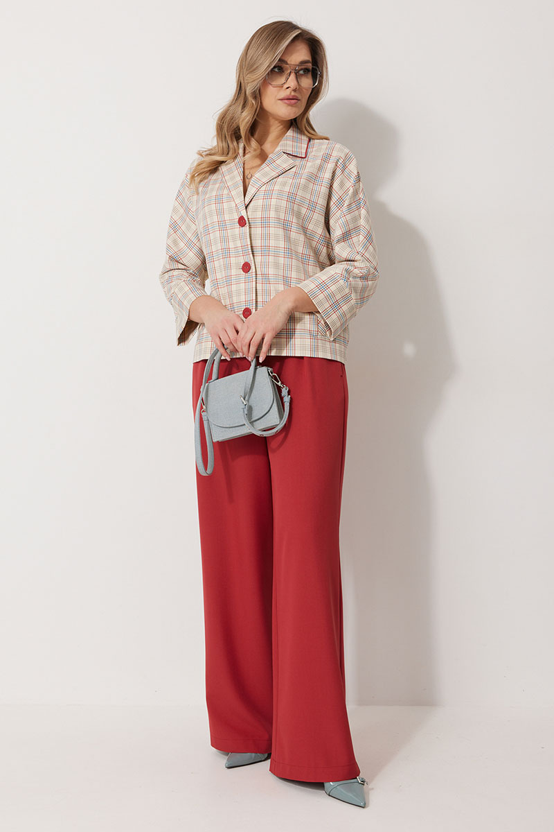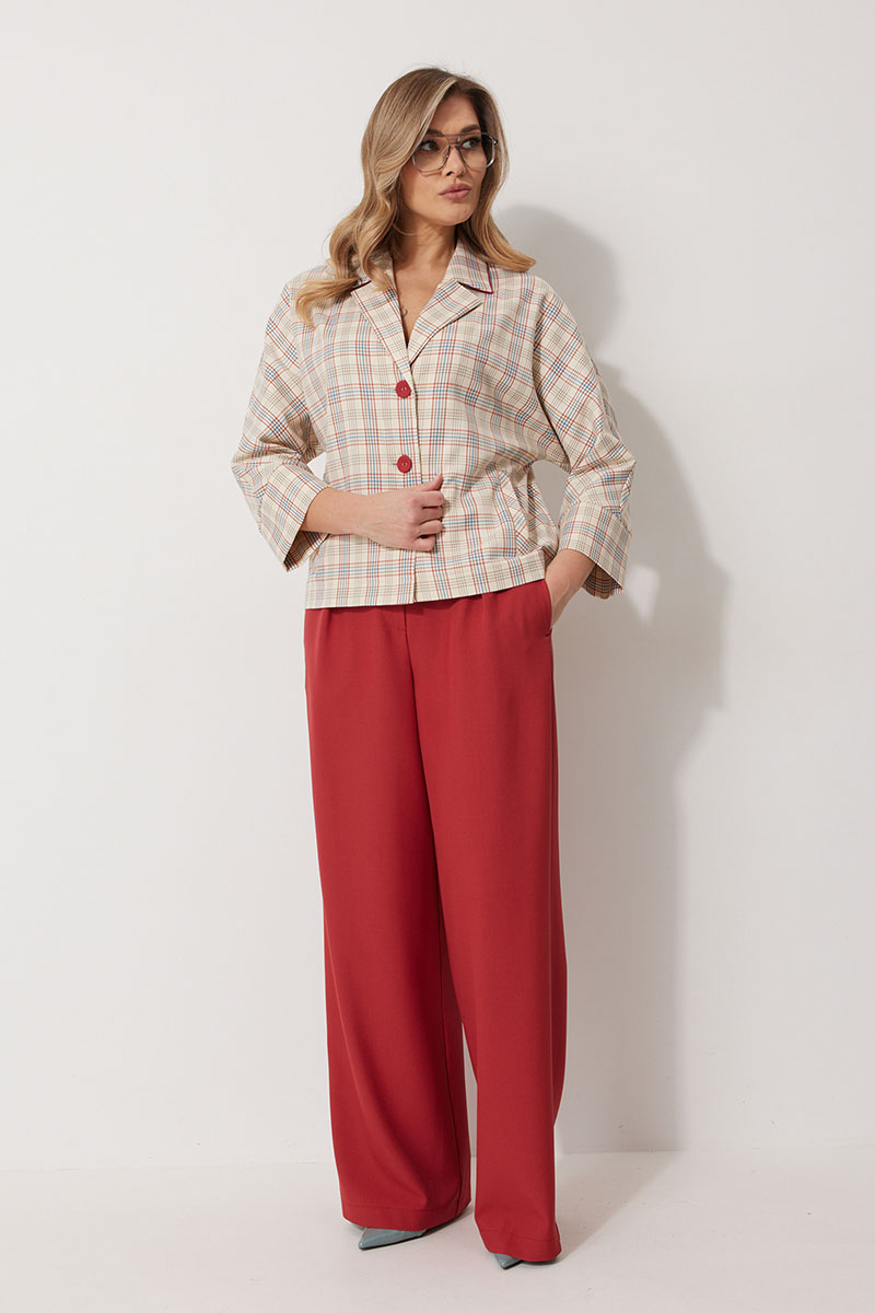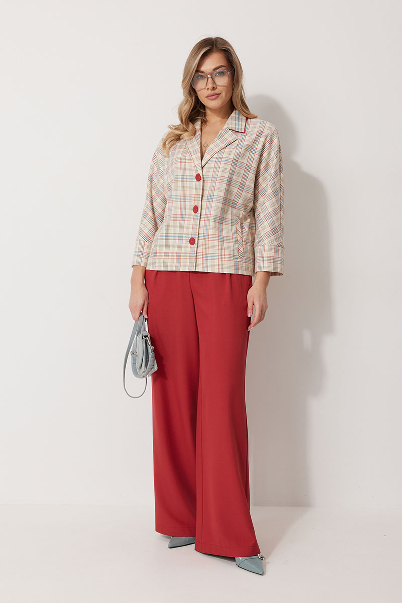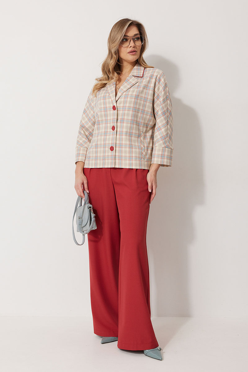 Жакет без подкладки, кроя «летучая мышь», с центральной однобортной застежкой на петли и пуговицы. По переду обработаны вертикальные прорезные карманы с листочкой. Спинка цельнокроеная. Горловина V-образной формы, обработана воротником пиджачного типа с контрастным кантом. Рукав 7/8, по низу обработан широкой притачной манжетой.
