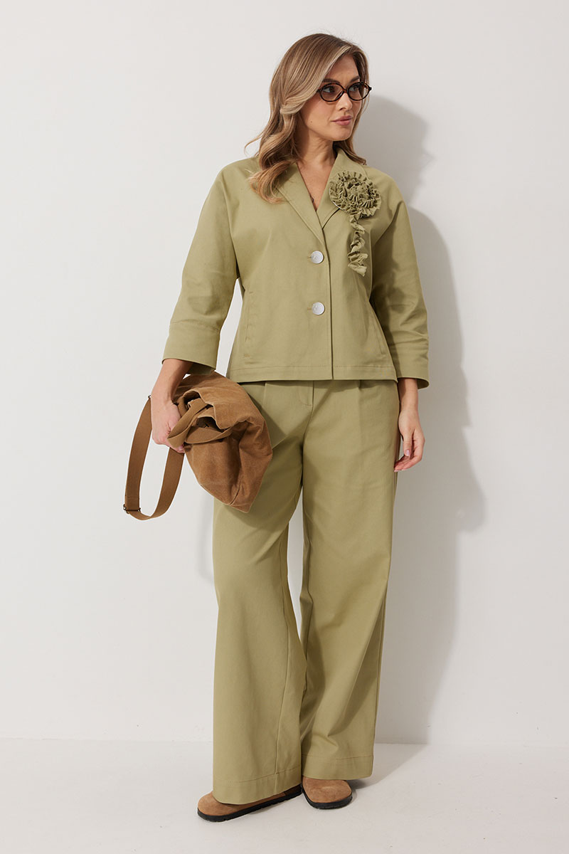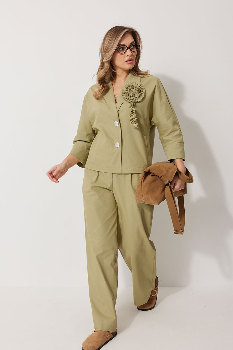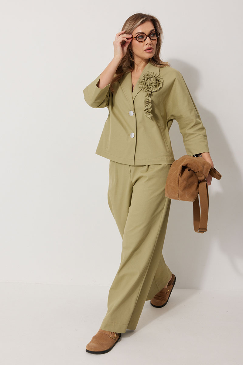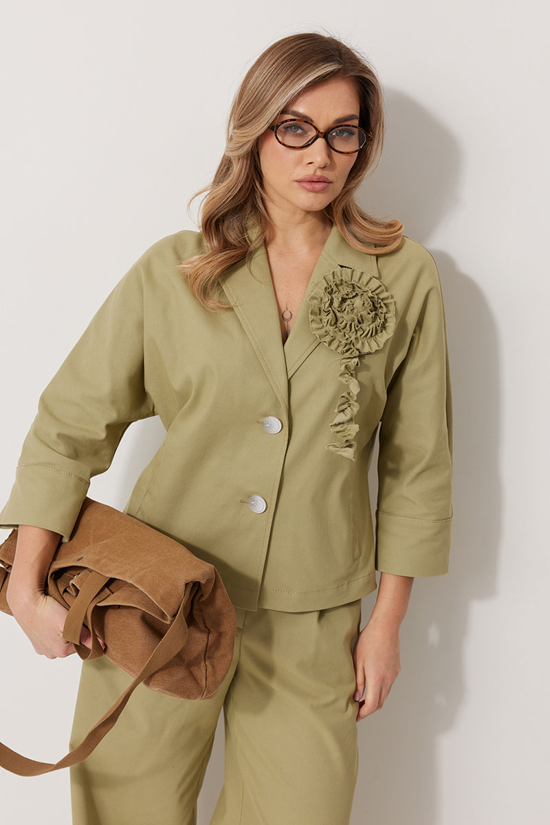 Жакет без подкладки, кроя «летучая мышь», с центральной однобортной застежкой на петли и пуговицы. По переду обработаны вертикальные прорезные карманы с листочкой. Спинка цельнокроеная, слева расположен декор в виде авторской броши. Горловина V-образной формы, обработана воротником пиджачного типа. Рукав 7/8, по низу обработан широкой притачной манжетой.