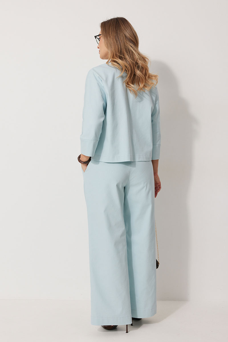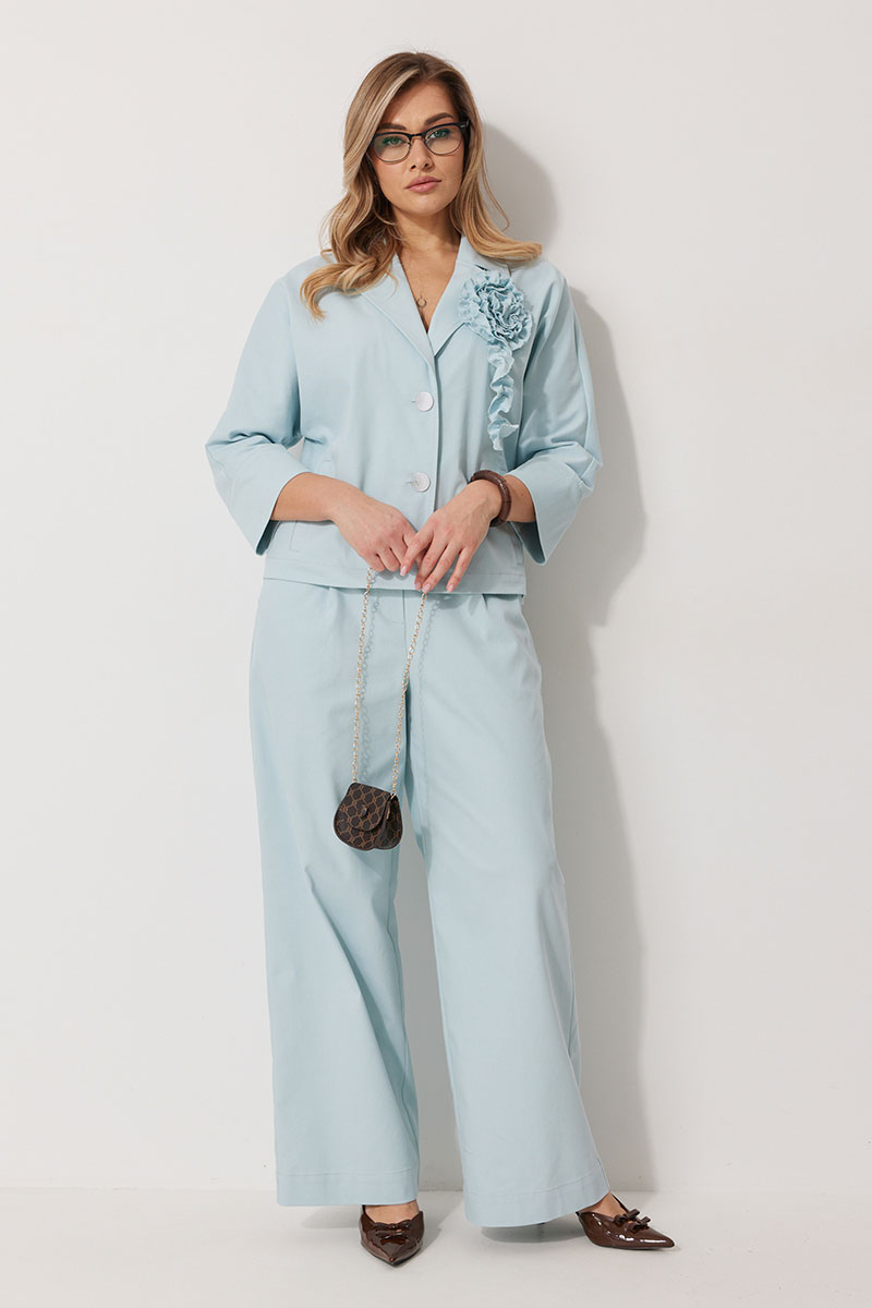 Жакет без подкладки, кроя «летучая мышь», с центральной однобортной застежкой на петли и пуговицы. По переду обработаны вертикальные прорезные карманы с листочкой. Спинка цельнокроеная, слева расположен декор в виде авторской броши. Горловина V-образной формы, обработана воротником пиджачного типа. Рукав 7/8, по низу обработан широкой притачной манжетой.