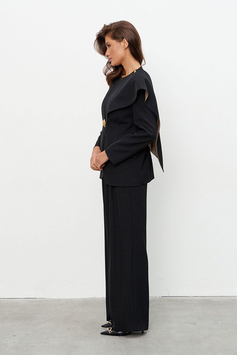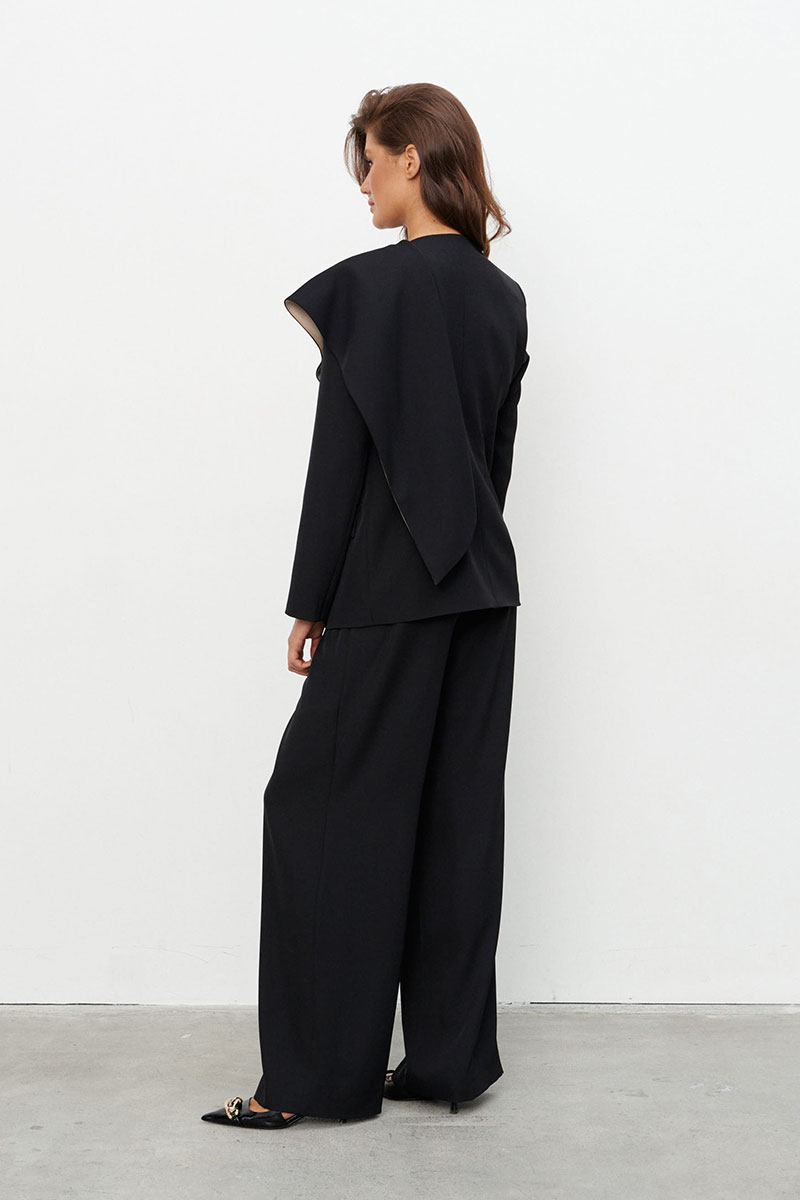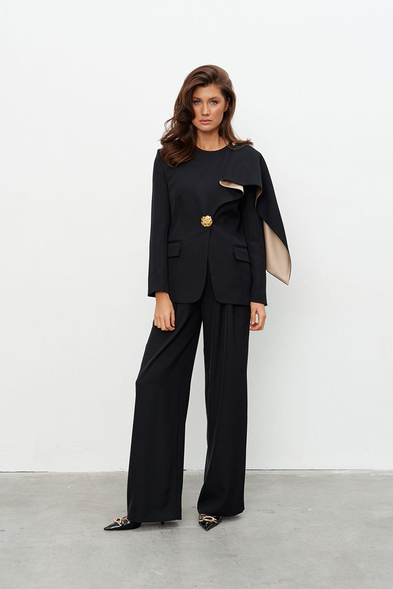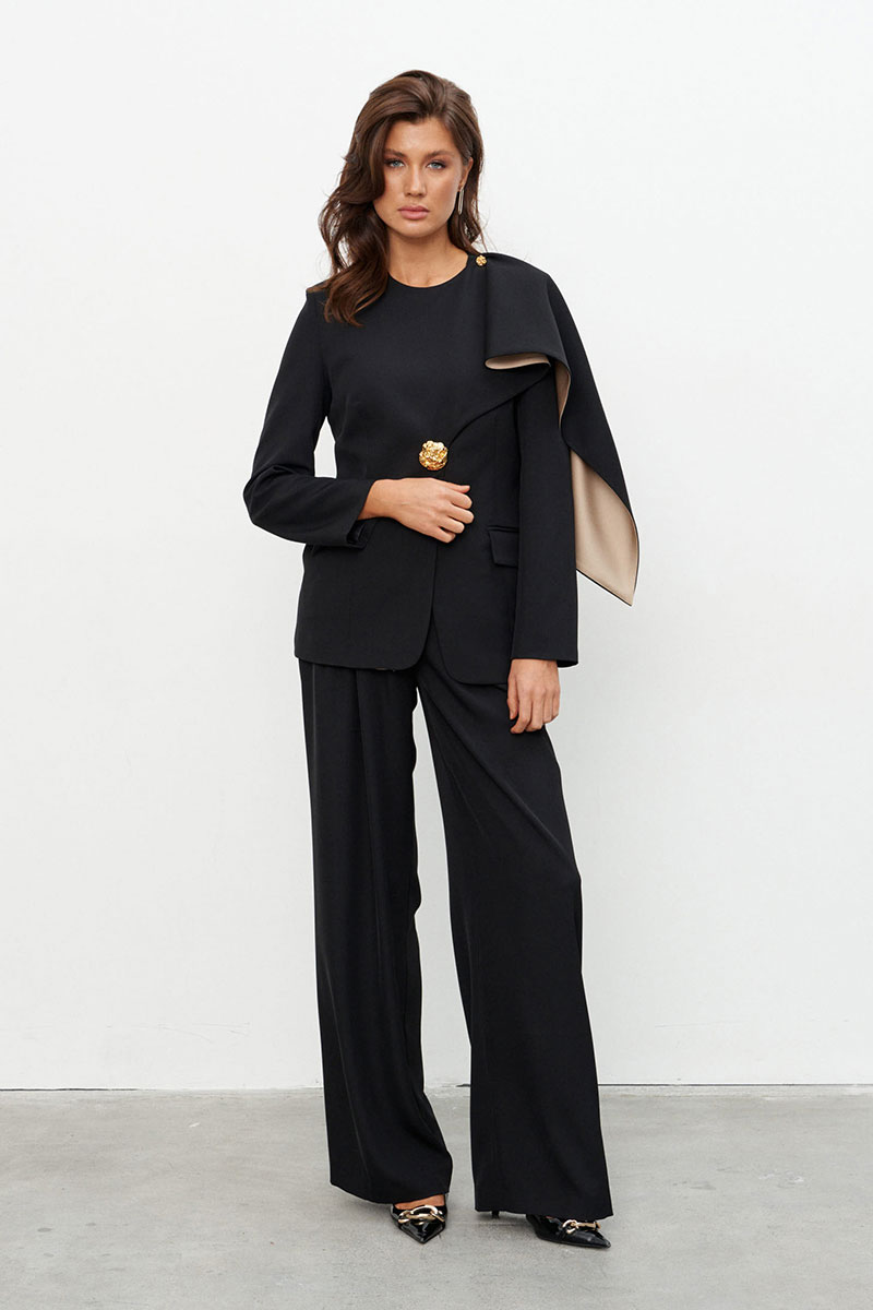 Комплект, состоящий из жакета и брюк, выполненных из струящейся ткани.