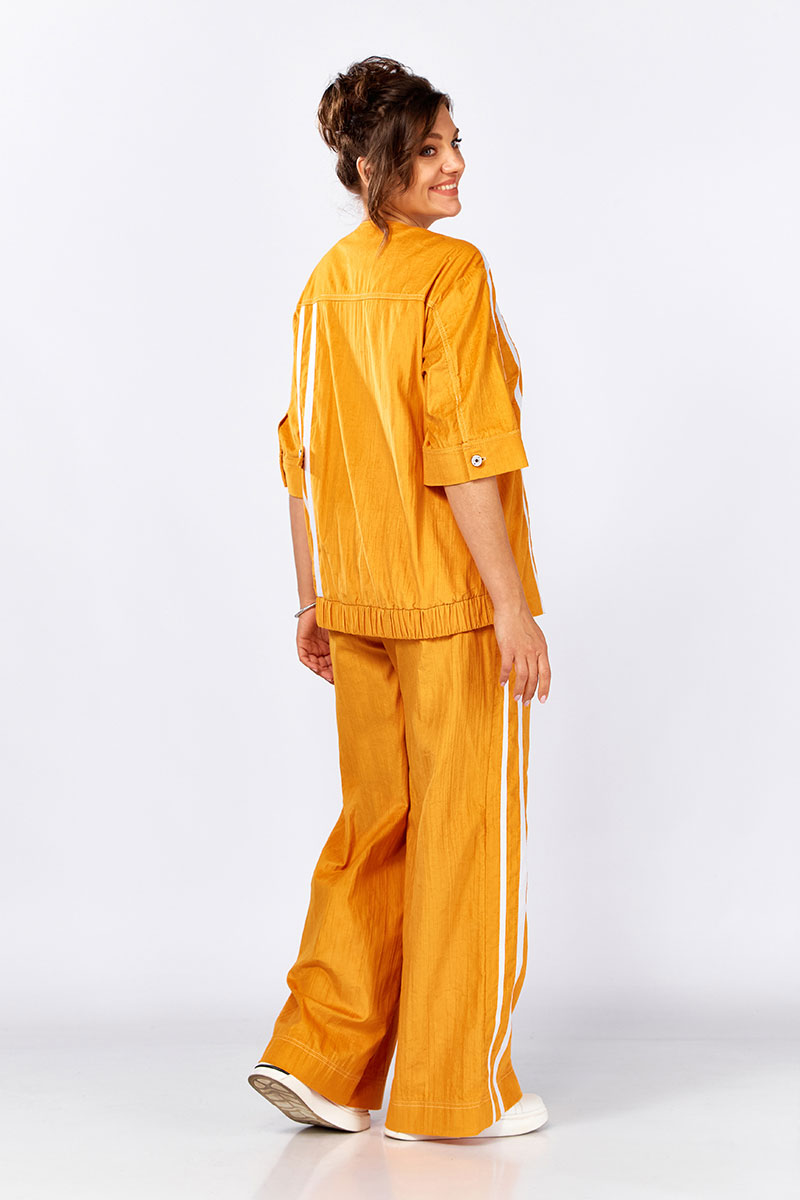 Супермодный костюм в стиле спорт-шик из легкого хлопкового микровельвета с креш-эффектом, идеален для летнего отдыха и городских прогулок. Яркий акцент костюму придает асимметричный карман на полочке с декоративными элементами имитации пояса и отделка из киперной белой тесьмы по рукаву полочке, спинке и брюкам.