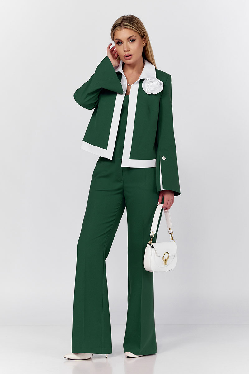 Жакет "BLAZER" без застежки на подкладке, рукав втачной расширенный к низу с декоративной шлицей. Изящность комплекту придает контрастная отделка воротника, планок, разреза шлицы и съемного декоративного цветка ручной работы подчеркнет вашу неотразимость и безупречный вкус.
