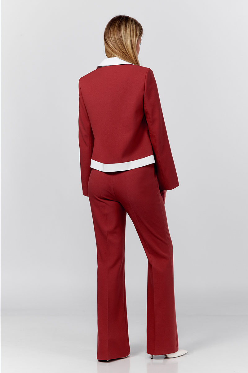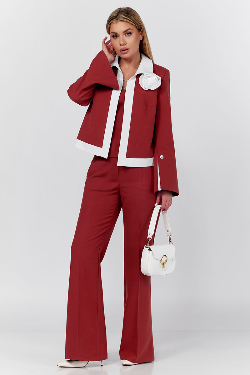 Жакет "BLAZER" без застежки на подкладке, рукав втачной расширенный к низу с декоративной шлицей. Изящность комплекту придает контрастная отделка воротника, планок, разреза шлицы и съемного декоративного цветка ручной работы подчеркнет вашу неотразимость и безупречный вкус.