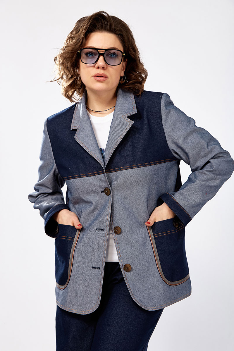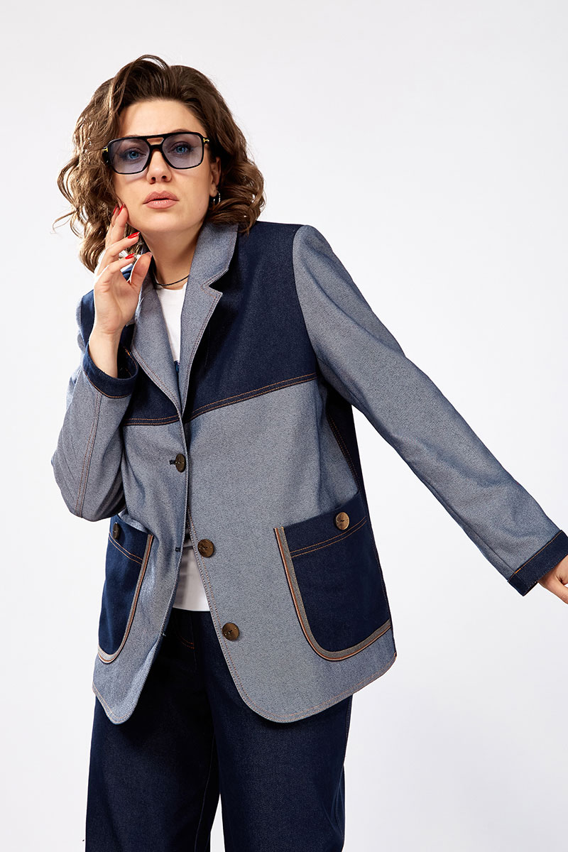 Жакет комбинированный, классического кроя, свободного силуэта без подкладки. Рукав втачной двухшовный с притачной манжетой, по полочке кокетка и накладные карманы. Застежка на петли пуговицы.
