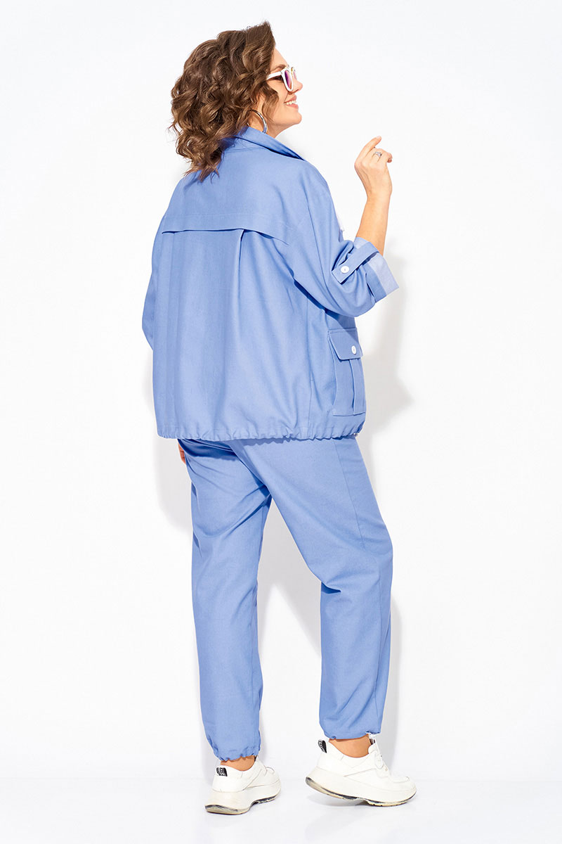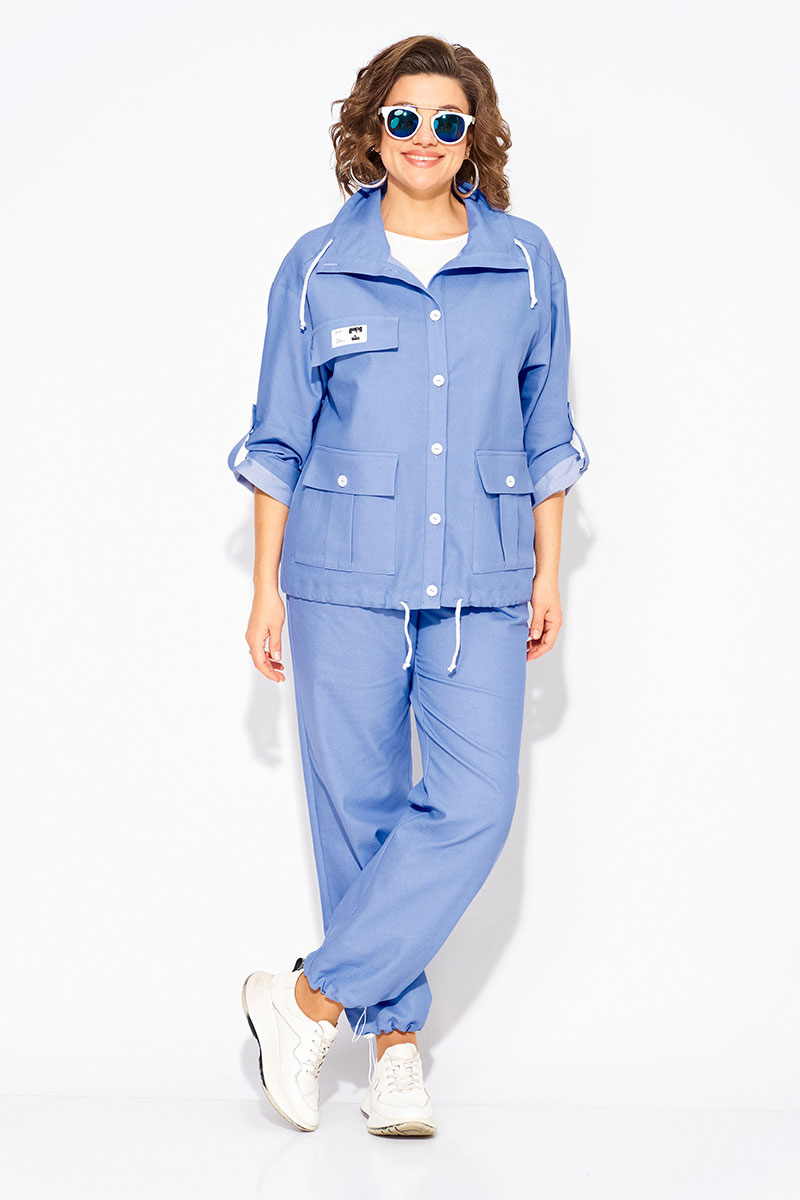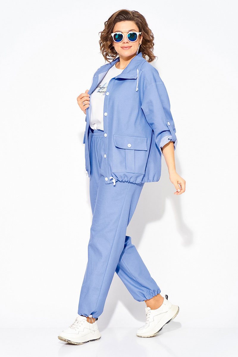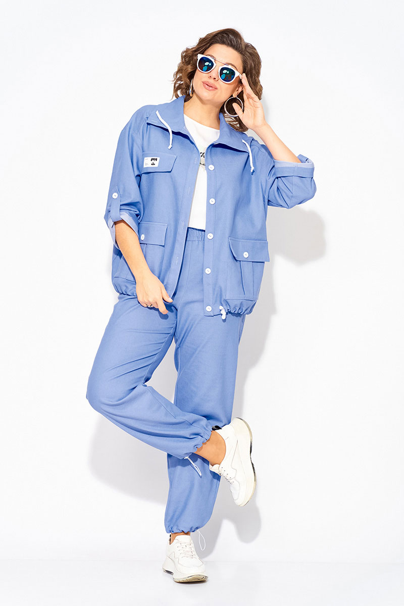 Модель парки, свободного силуэта с эффектным отложным воротником на кулиске. Застежка центральная, на планке, на петли и пуговицы. Рукав на спущенном плече, длиной ¾-ти с застежкой на пату. По полочке расположены накладные карманы с клапаном. Спинка с отрезной кокеткой и заложенными складками на свободу. По низу изделия предусмотрена кулиска (утяжка) т на декоративную шнуровку. Брюки в костюме с завышенной посадкой, на притачном поясе с круговой резинкой. В брюках имеются боковые карманы.