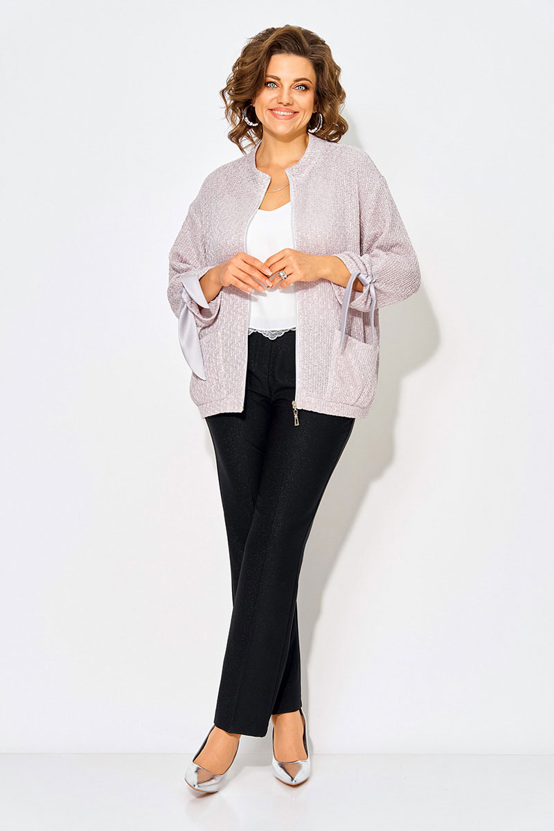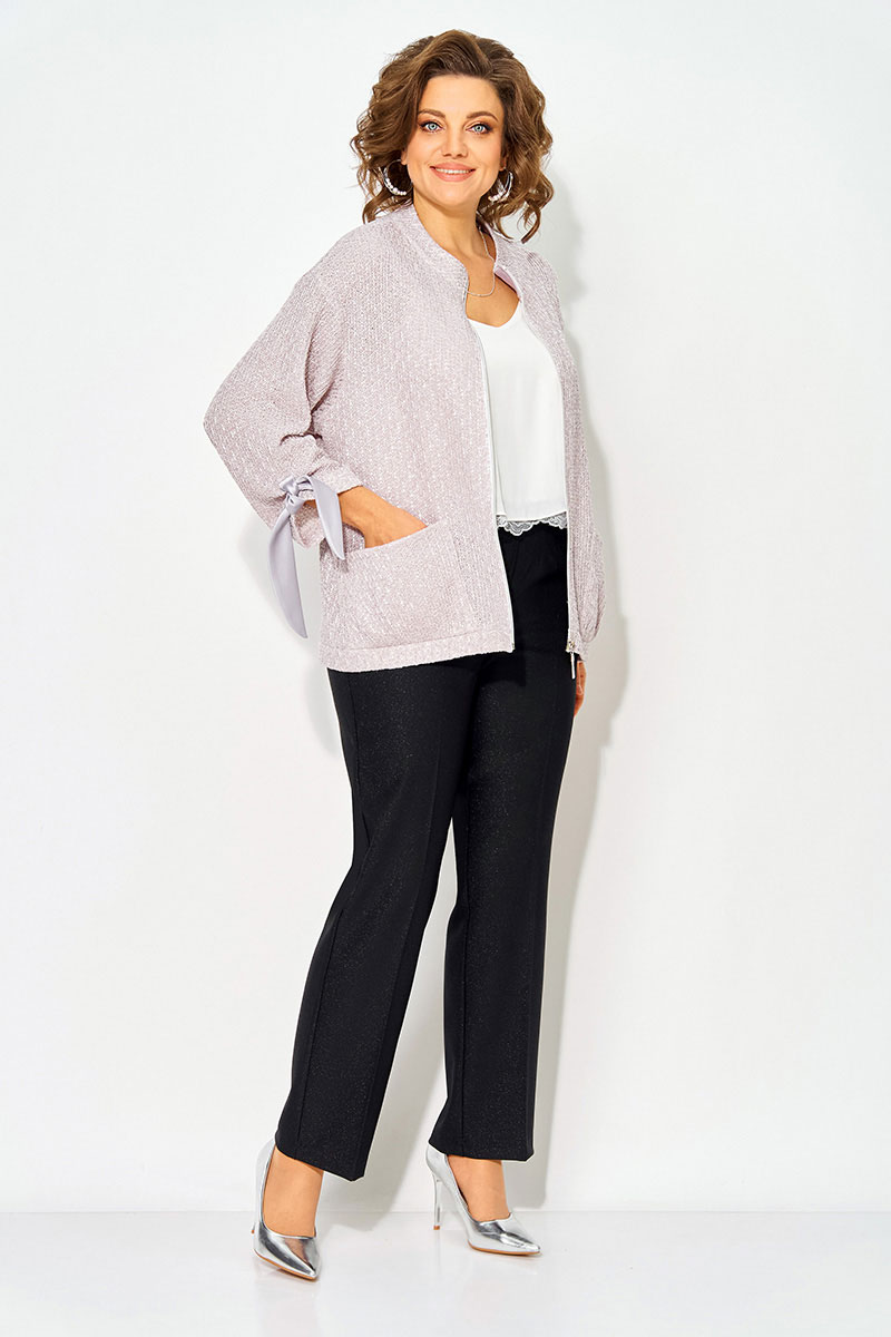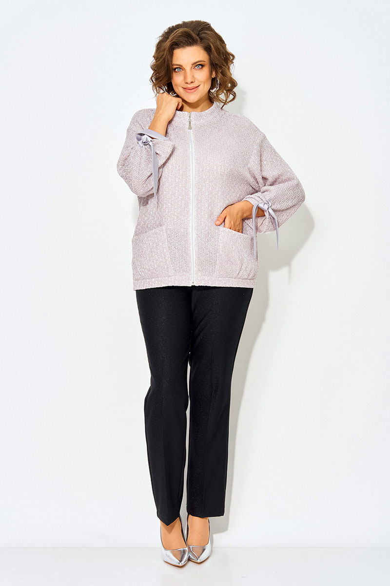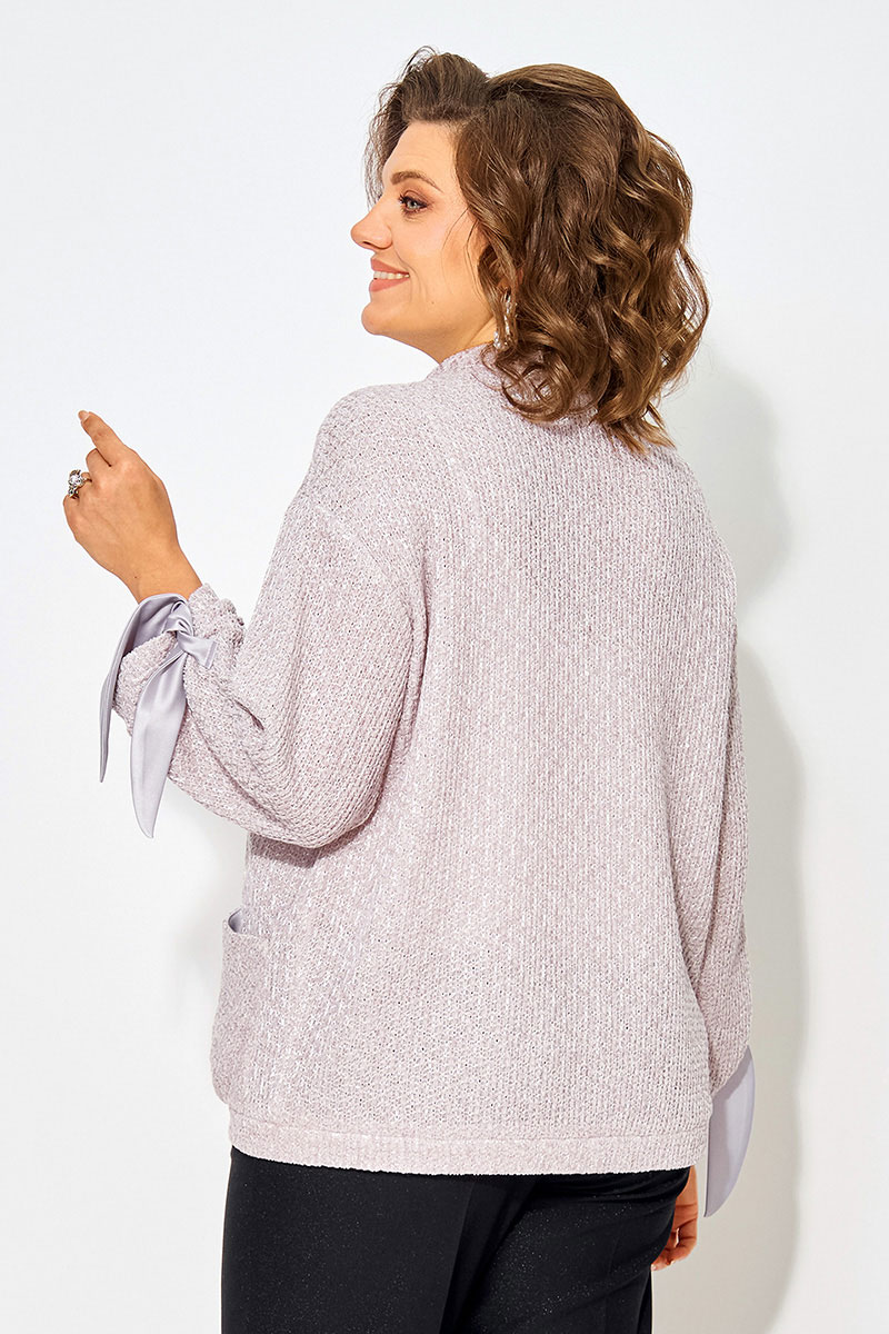 Модель свободного силуэта, с рукавом длиной ¾ на спущенном плечевом поясе. Горловина обработана полулежащей стойкой. Застежка центральная на молнию. По полочке расположены аккуратные накладные карманы. Низ изделия оформлен притачной планкой. Изюминкой данной моделям служит необычные паты по рукаву с завязкой в виде банта. Этот вязанный трикотажный жакет - идеальный вариант для создания стильного и привлекательного романтического образа! Мягкий и нежный материал делает его очень приятным на ощупь, теплым и уютным, а легкое мерцание придает свою изюминку.