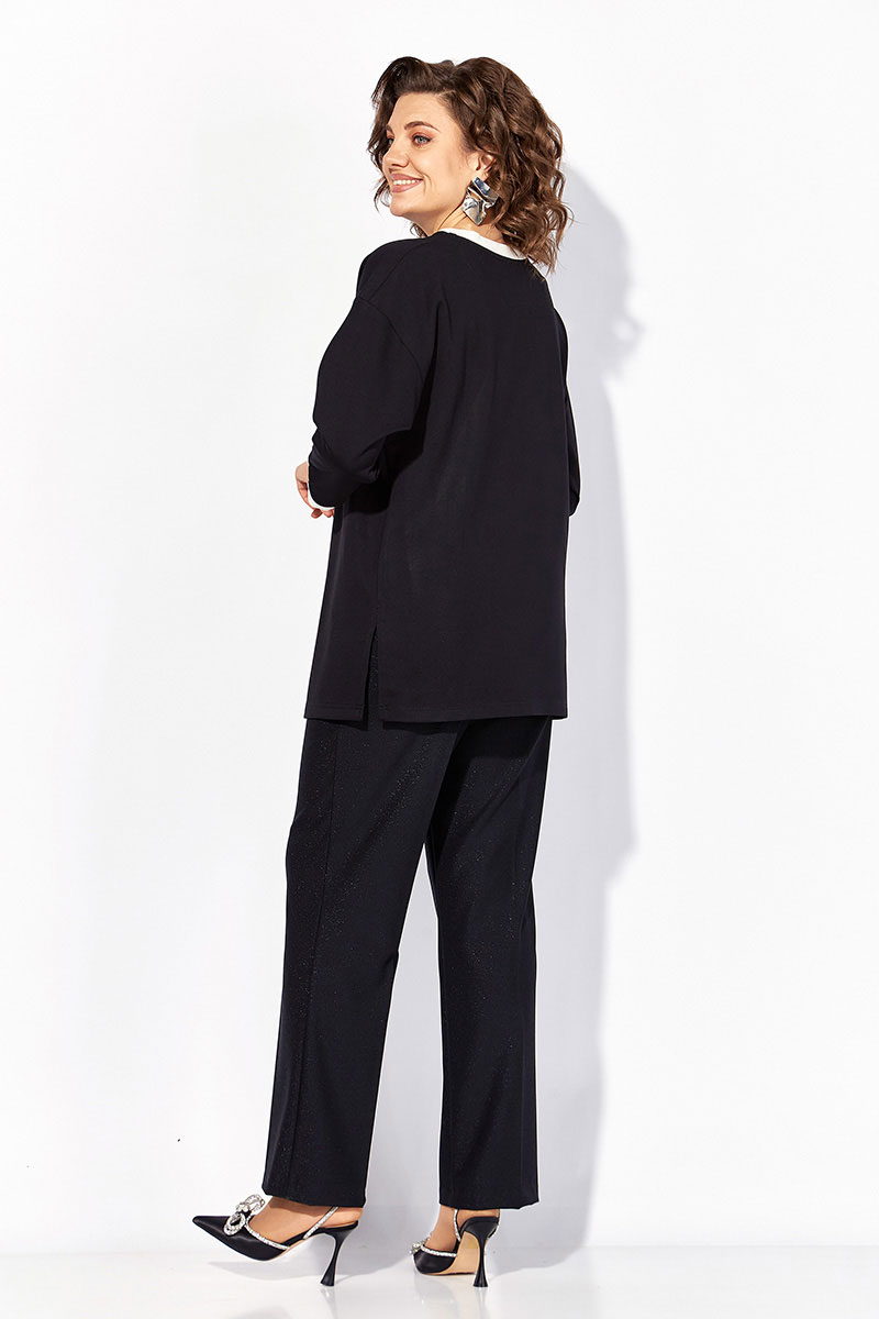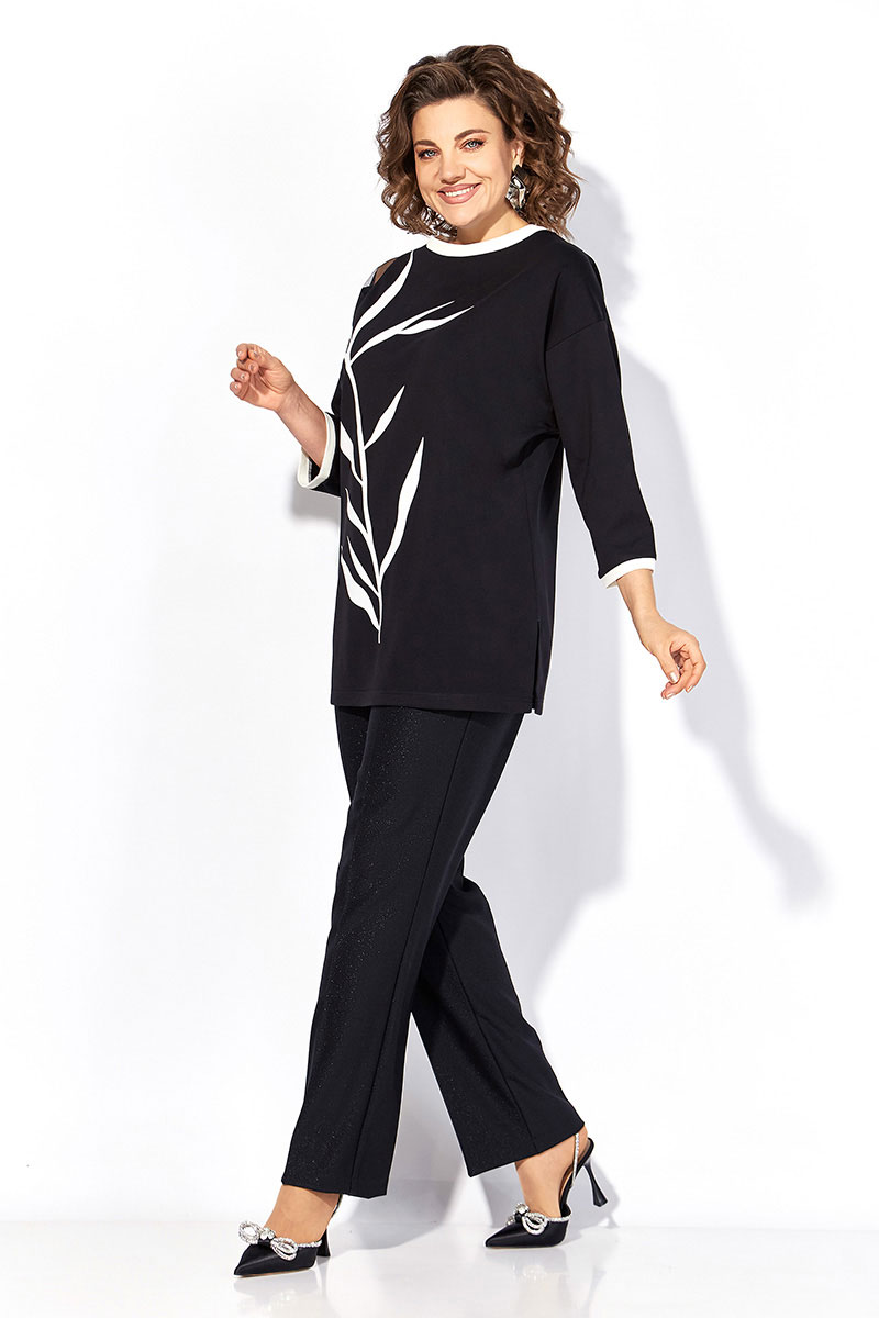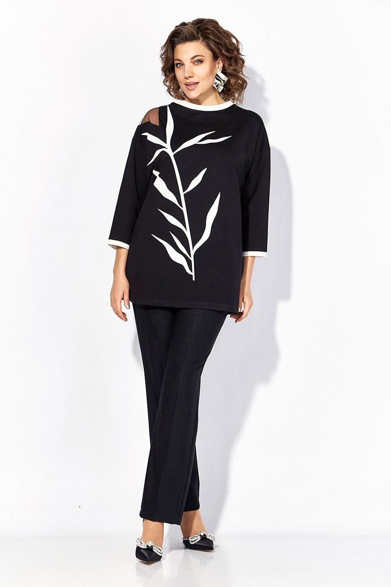 Нарядная блузка-туника больших размеров, выполнена из трикотажного джерси. Модель прямого силуэта, со спущенной линией плеча и рукавом длиной ¾-ти. Модель с округлым вырезом горловины на мягкой притачной планке контрастного цвета. По бокам предусмотрены разрезы на свободу. Полочка декорирована печатью накатом с мерцающим эффектом в виде ветви. На плече ассиметричная вставка из сетки. Брюки в комплекте прямого фасона, средней посадки. Пояс притачной, в боковых участках вставлена резинка. Застежка – брючная тесьма-молния с обработанным гульфиком. По переду заутюжены канты. Брюки с боковыми карманами.