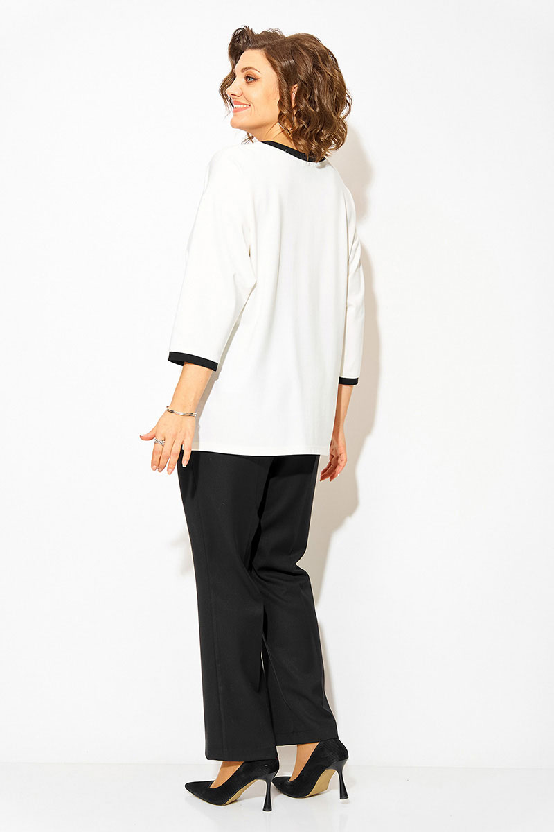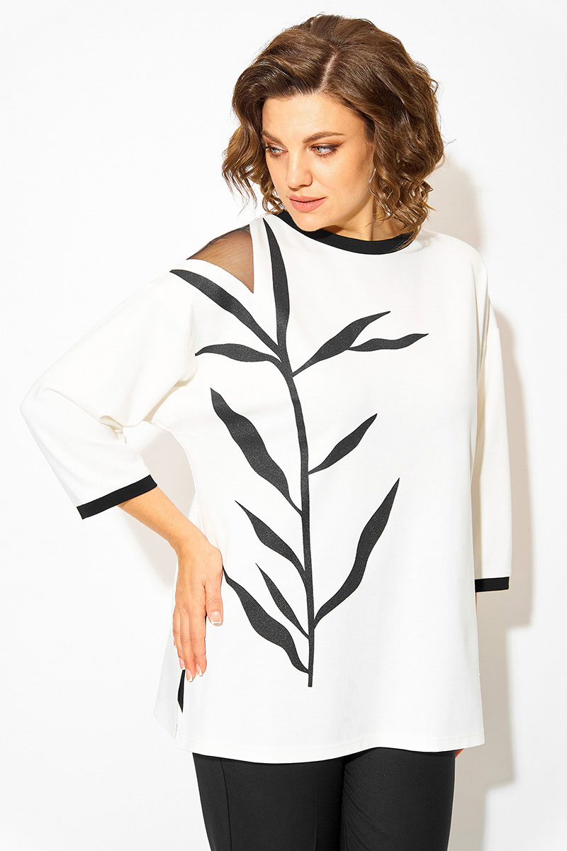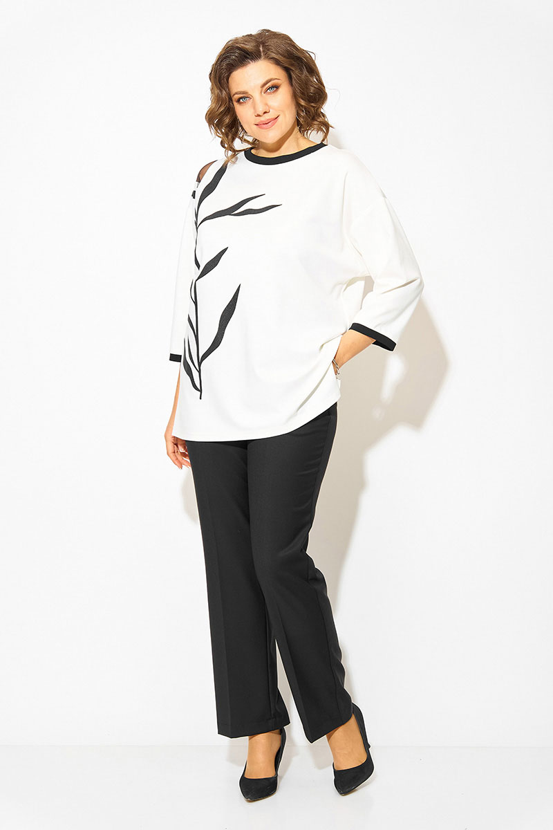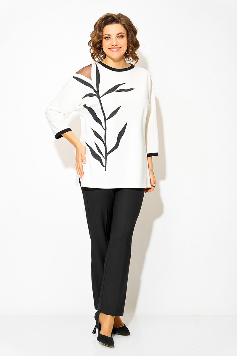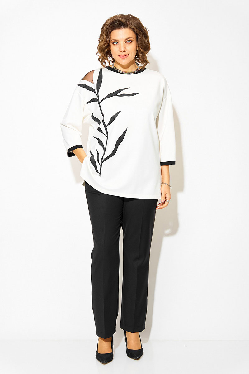 Нарядная блузка-туника больших размеров, выполнена из трикотажного джерси. Модель прямого силуэта, со спущенной линией плеча и рукавом длиной ¾-ти. Модель с округлым вырезом горловины на мягкой притачной планке контрастного цвета. По бокам предусмотрены разрезы на свободу. Полочка декорирована печатью накатом с мерцающим эффектом в виде ветви. На плече ассиметричная вставка из сетки. Брюки в комплекте прямого фасона, средней посадки. Пояс притачной, в боковых участках вставлена резинка. Застежка – брючная тесьма-молния с обработанным гульфиком. По переду заутюжены канты. Брюки с боковыми карманами.