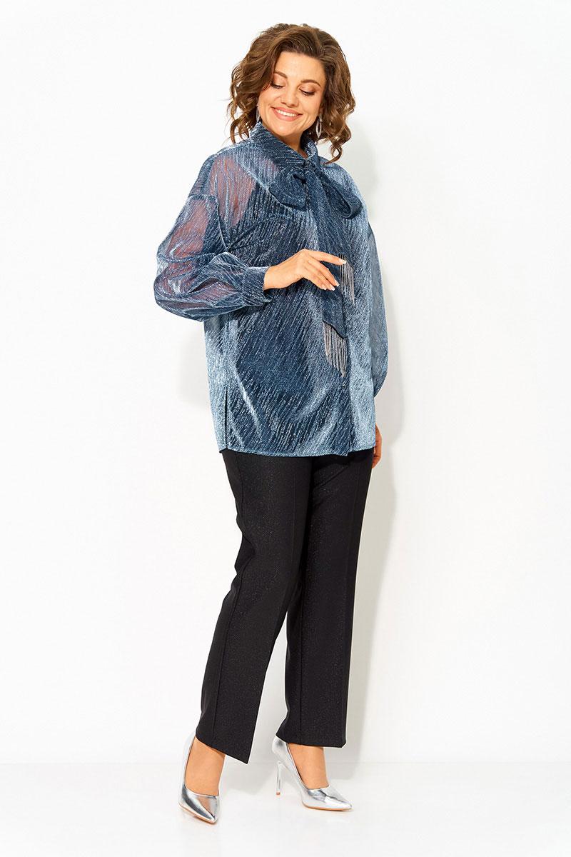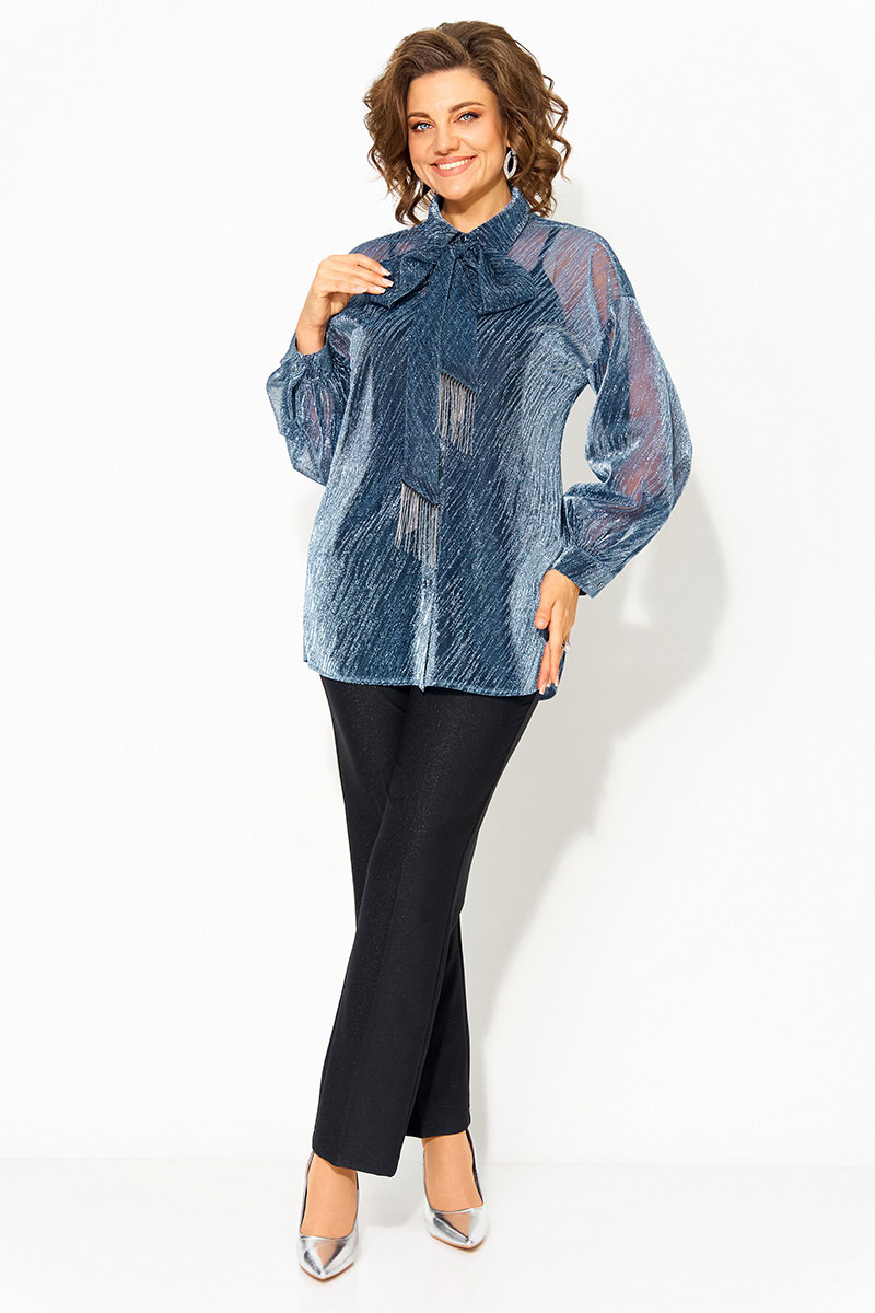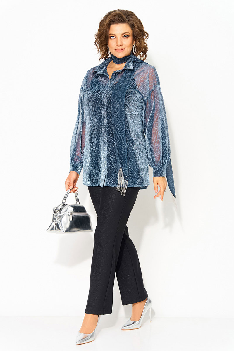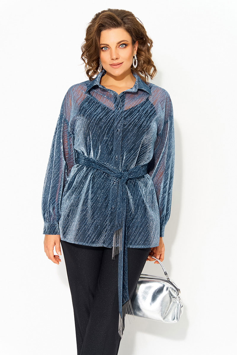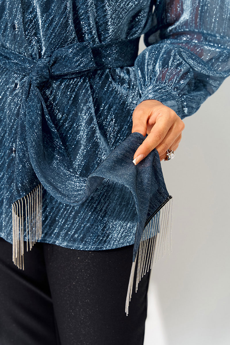 Трендовая блузка из легкой сетчатой ткани c эффектом мерцания станет стильным дополнением вашего гардероба. Ее можно комбинировать с различными элементами гардероба, накинуть поверх платья или топа. Модель выполнена с воротником-стойкой, который добавляет элегантности образу.  Застежка центральная на петли и пуговицы. По бокам расположены разрезы. Свободный крой обеспечивает комфорт и подчеркивает женственность.  Длинный рукав с манжетами делает ее универсальной для любого сезона, а удлиненный силуэт добавляет изысканности. В комплект входит съёмный пояс с декоративной бахромой, который может служить в виде шарфика и добавить элегантность образу.