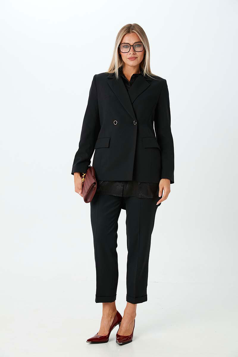 Жакет двубортный умеренного объёма. Застёжка на две пуговицы. По бокам расположены функциональные прорезные карманы с клапаном. Жакет на подкладке.