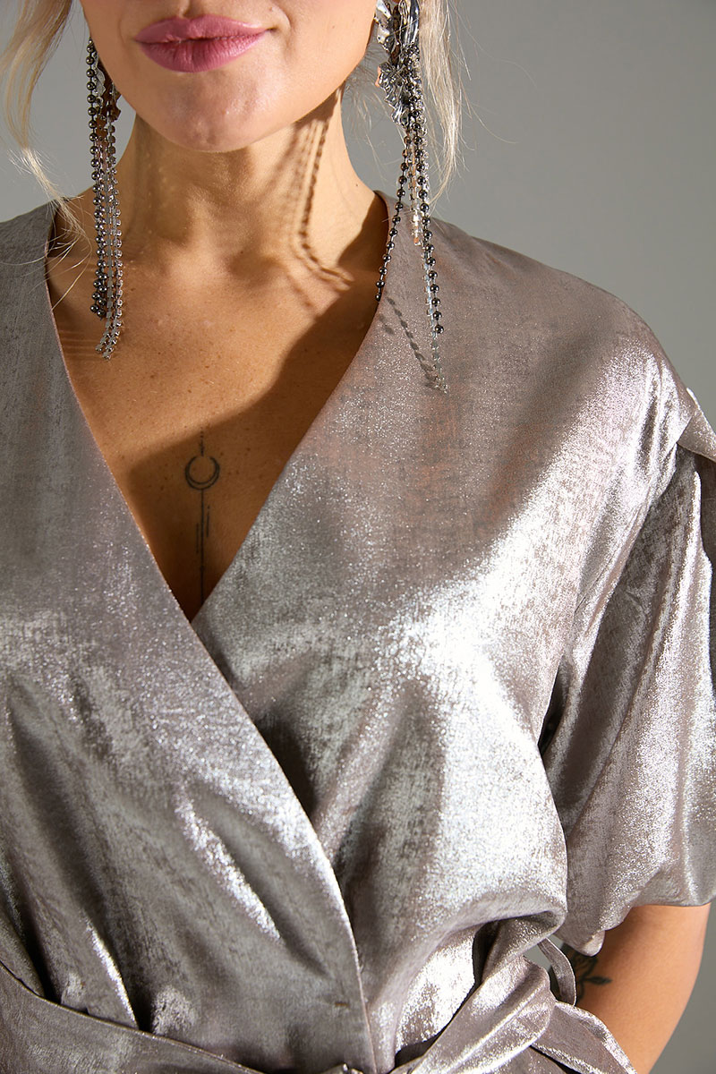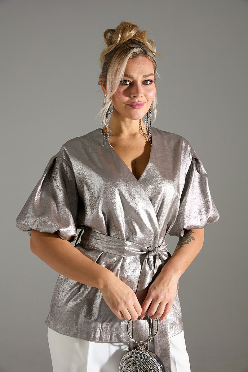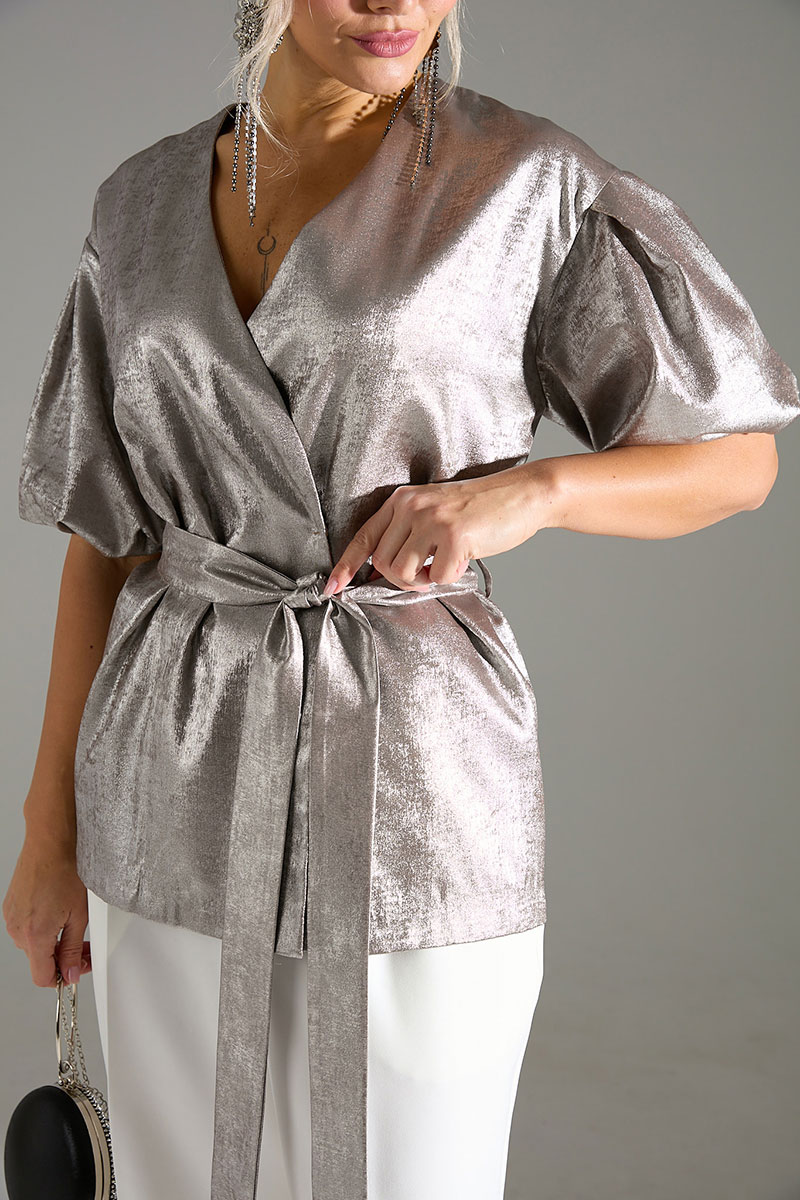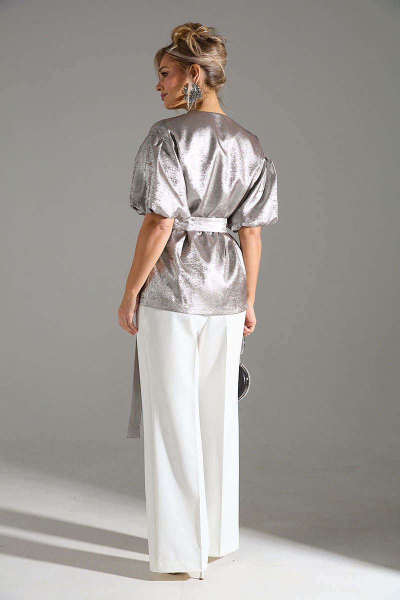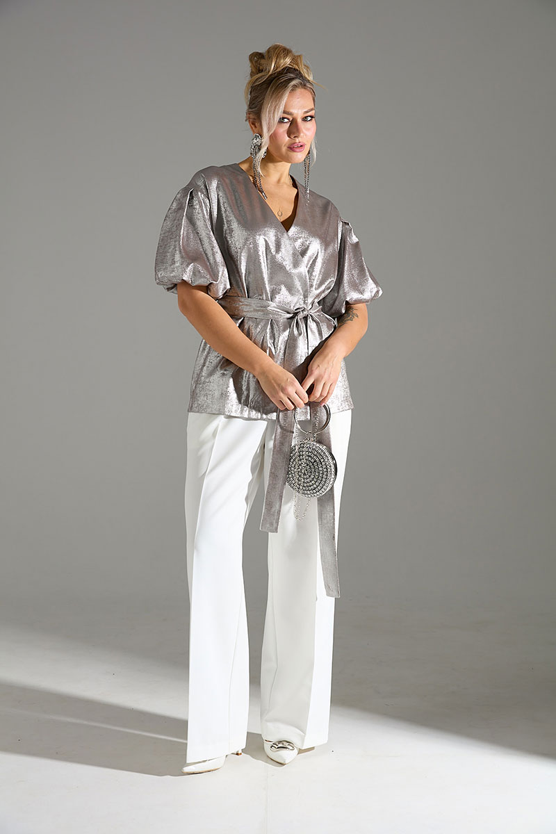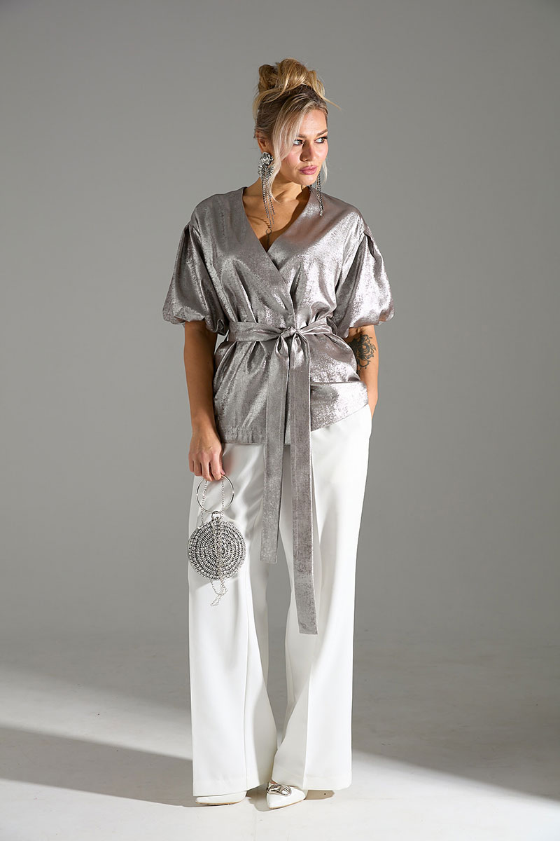 Комплект 2ка, состоящий из жакета и брюк. Легкий жакет на подкладке с объёмными рукавами. Перед на запах с застежкой на кнопки, под пояс по талии.