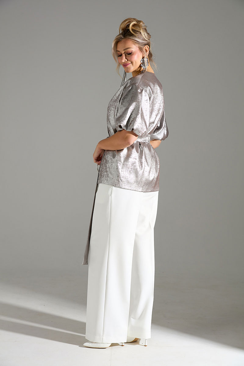 Брюки широкого объема, прямого силуэта. На передних половинках брюк заутюжены стрелки, переходящие в складки по линии талии. На задних половинках также заутюжены стрелки. В боковых швах расположены карманы. Застежка-гульфик. Пояс отрезной, притачной. В задней части пояса вставлена эластичная тесьма (резинка). На пояс настрочены шлевки. Выступающая часть пояса застегивается на петлю и крючок.