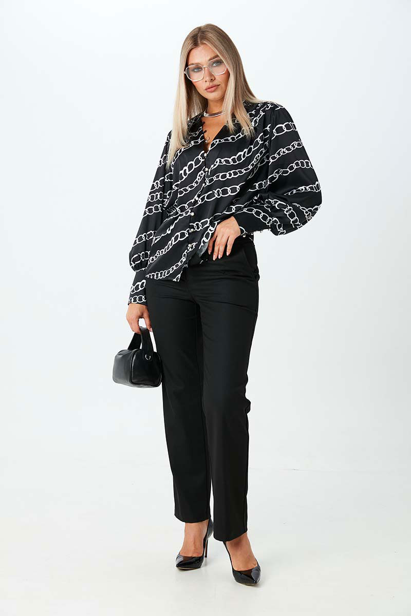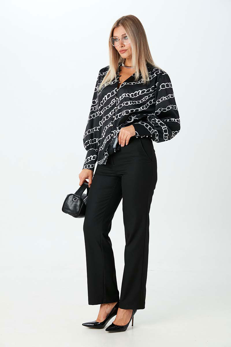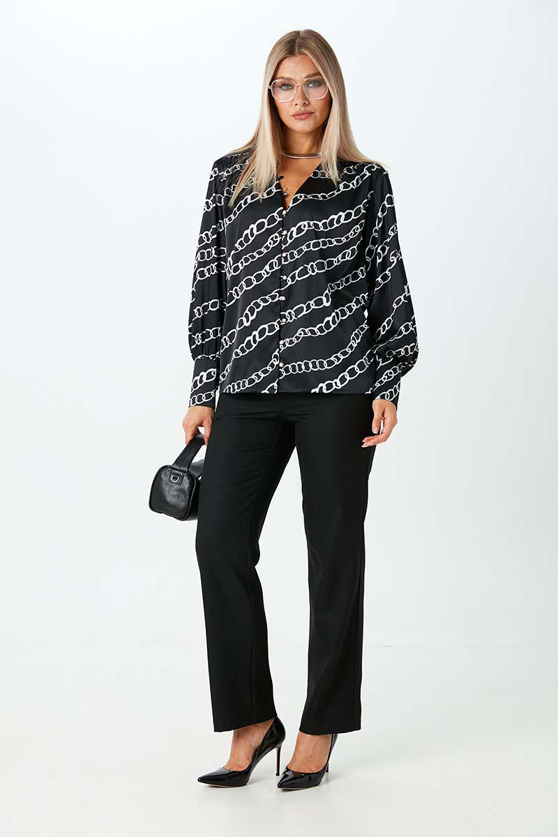 Блуза из тонкой ткани с атласным эффектом, свободного силуэта с V-образным вырезом. Это довольно глубокий вырез, который прекрасно подчёркивает декольте и линию шеи. Застежка на навесные петли и пуговицы. Рукава длинные объёмные втачные заканчиваются широкой манжетой с застёжкой на навесные петли с пуговицами.