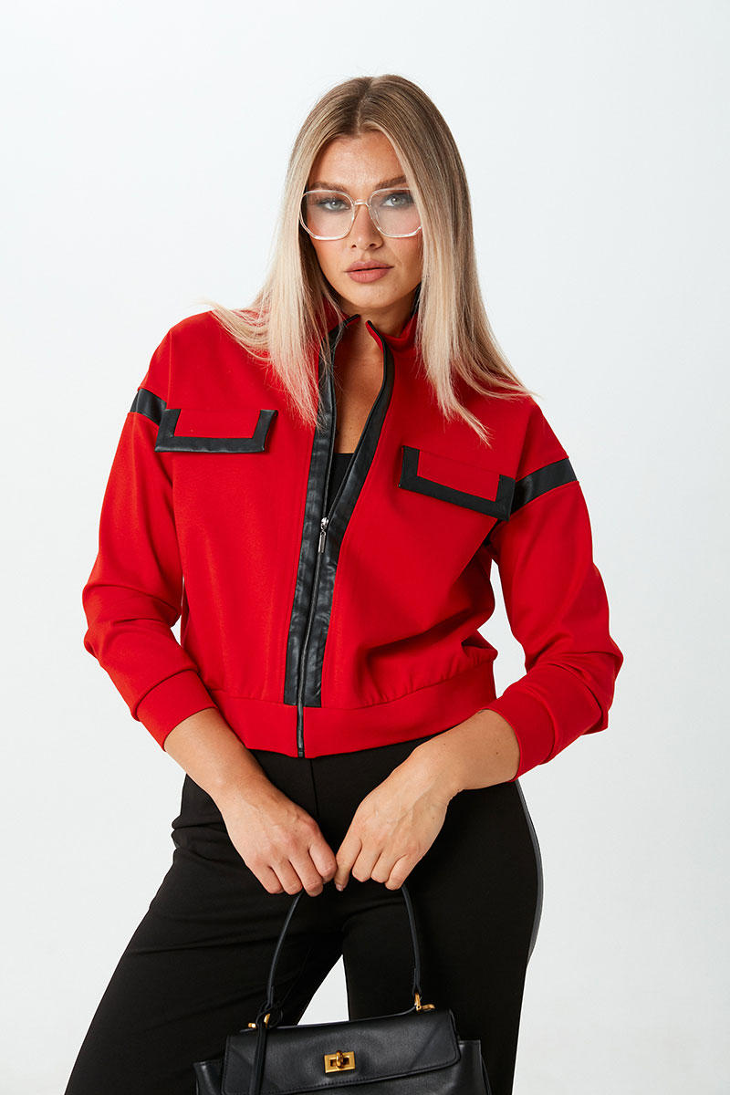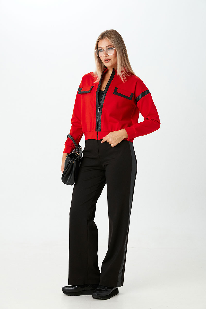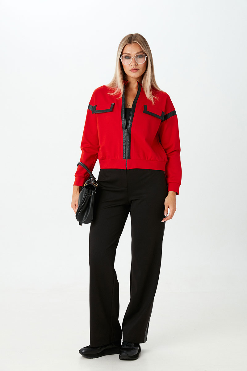 Укороченный джемпер свободного силуэта с застёжкой на молнию. Воротник - стойка. По переду выполнена имитация карманов с клапанами с окантовкой из экокожи. На рукавах и вдоль молнии также вставка из экокожи.