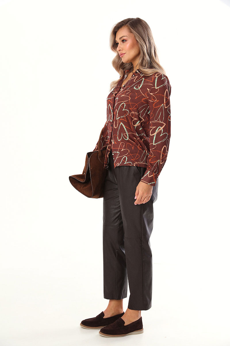 Блузка прямого силуэта с оригинальным принтом из лёгкой ткани с атласным мягким блеском. Воротник рубашечного типа, застежка на прорезные петли и пуговицы. В нижней части рукава заложены складки, манжета на двух пуговицах.
