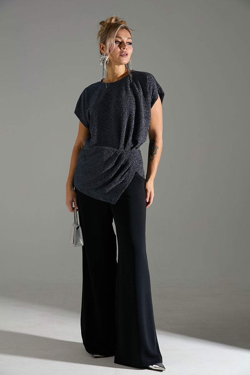 Костюм 2ка, состоящий из джемпера и брюк. Джемпер свободного силуэта с короткими цельнокроеными рукавами и оригинальным кроем. Низ джемпера ассиметричный. Брюки широкого объема, прямого силуэта. В боковых швах расположены карманы. Застежка-гульфик. Пояс отрезной, притачной. В задней части пояса вставлена эластичная тесьма (резинка). Пояс застегивается на петлю и крючок.