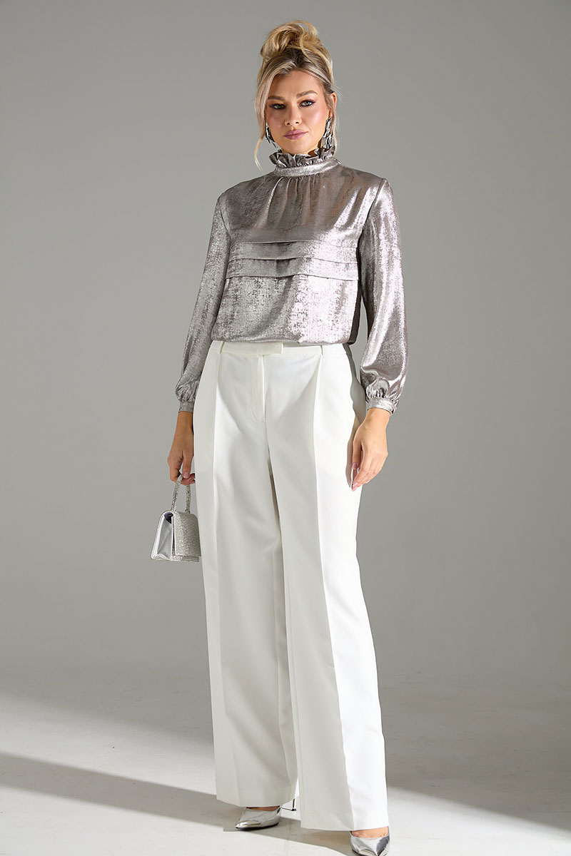Комплект 2-ка, состоящий из блузы и брюк. Элегантная блуза из легкой ткани свободного силуэта. По переду блузки добавлен оригинальный элемент в виде складок.Отделка горловины рюшами и красивым бантом по спинке делает блузку отличным вариантом для нарядного и романтичного образа! Рукава блузки объёмные, на манжетах выполнена застежка на пуговицу. Брюки широкого объема, прямого силуэта. На передних половинках брюк заутюжены стрелки, переходящие в складки по линии талии. На задних половинках также заутюжены стрелки. В боковых швах расположены карманы. Застежка-гульфик. Пояс отрезной, притачной. В задней части пояса вставлена эластичная тесьма (резинка). На пояс настрочены шлевки. Выступающая часть пояса застегивается на петлю и крючок.
