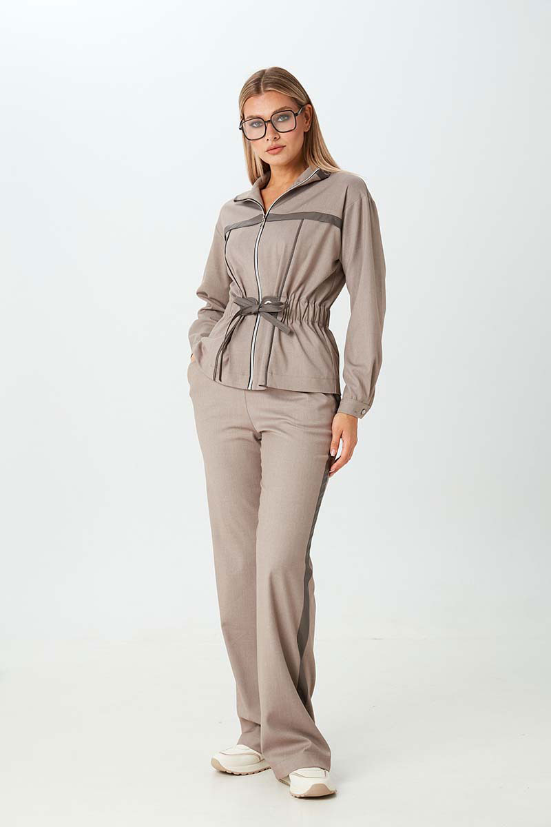 Брюки прямого силуэта на эластичной резинке по талии. По переду расположены карманы с наклонным входом. По бокам лампасы из отделочной кожи.