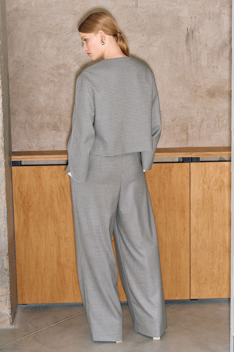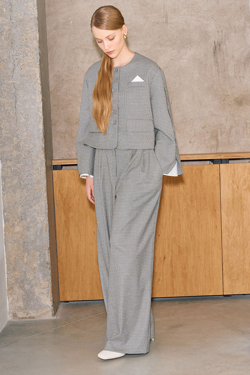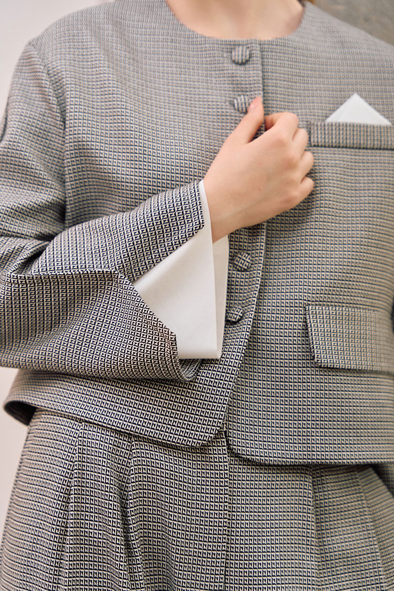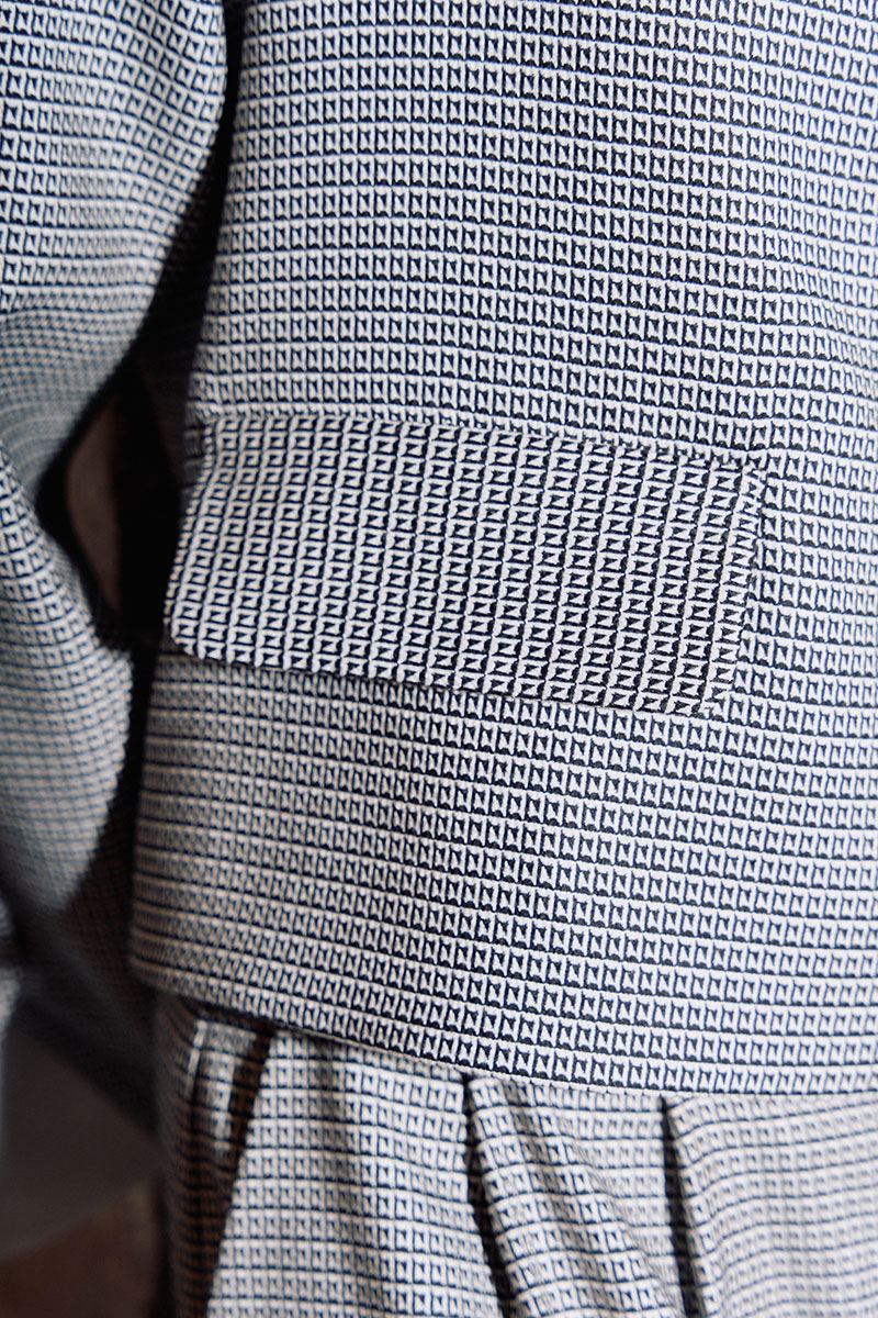 Жакет свободного кроя, прямого силуэта, на подкладке. Линия плеча спущена, рукав длинный, низ рукава фигурный, по низу рукава имитация рукава рубашки. Округлый вырез горловины, застежка центральная на петли и пуговицы. По бокам прорезные функциональные и отлетные клапаны. По левой стороне, выше линии груди, карман-листочка с платком.