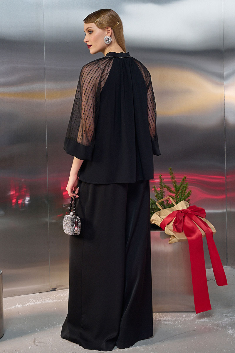 Костюм состоит из блузы и брюк. Блуза свободного кроя и состоит из двух видов ткани – сетка и плательно-костюмная. Рукав-реглан выполнен из сетки, по низу рукава отрезная деталь из основной ткани. Низ рукава собран на резинку, в шов втачивания рукава вшита тесьма со стразами. По горловине воротник-стойка. Застежка на петли и пуговицы. Брюки прямого силуэта на притачном поясе с резинкой по спинке, застёжка на молнию и петлю-пуговицу.