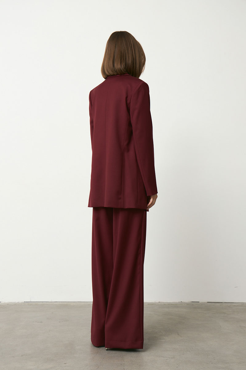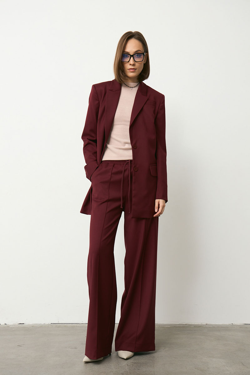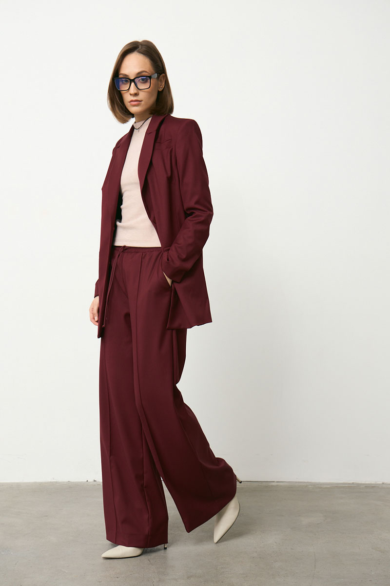 Брюки палаццо из гладкой костюмной ткани с отстроченными стрелками по передним деталям. Пояс притачной с эластичной тесьмой и шнурком. В боковых швах обработаны наклонные карманы.