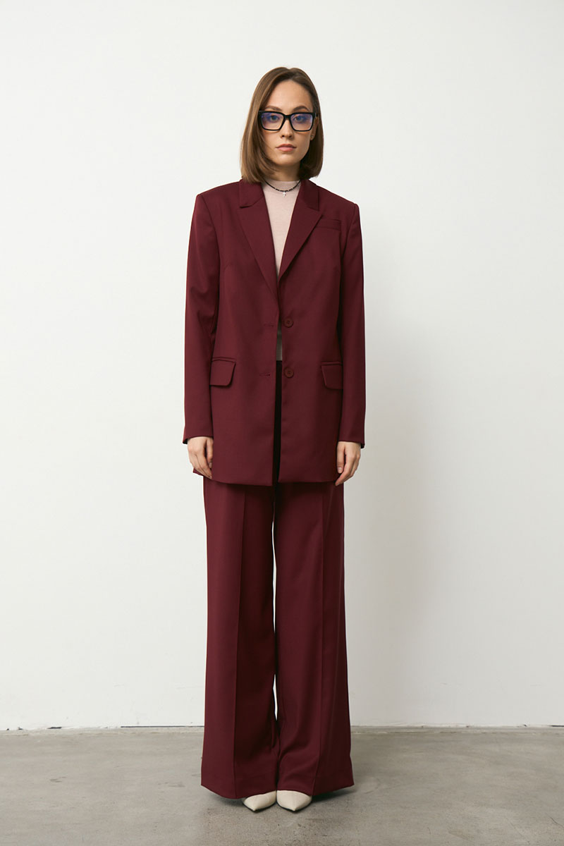 Жакет прямого силуэта, длиной до линии бедер с втачными рукавами до запястья, с воротником пиджачного типа. Застежка центральная на две прорезные петли и пуговицы. На деталях переда обработаны прорезные карманы в рамку с клапанами. На левой детали переда в области лацкана обработан прорезной карман-обманка с листочкой. Спинка с рельефами и средним швом. Изделие на подкладке.