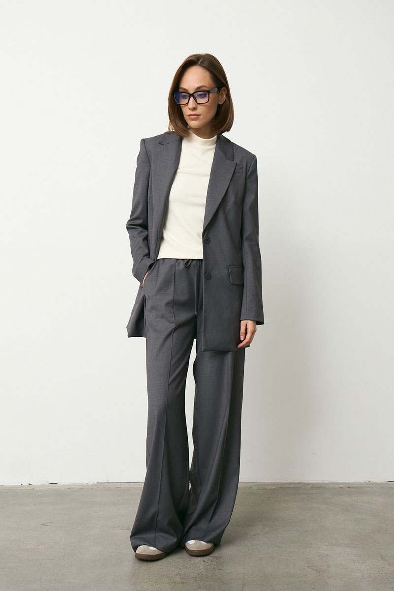 Брюки палаццо из гладкой костюмной ткани с отстроченными стрелками по передним деталям. Пояс притачной с эластичной тесьмой и шнурком. В боковых швах обработаны наклонные карманы.