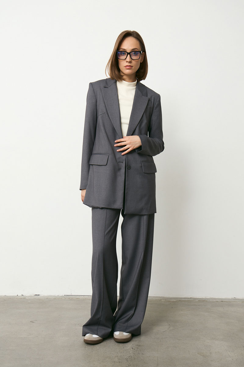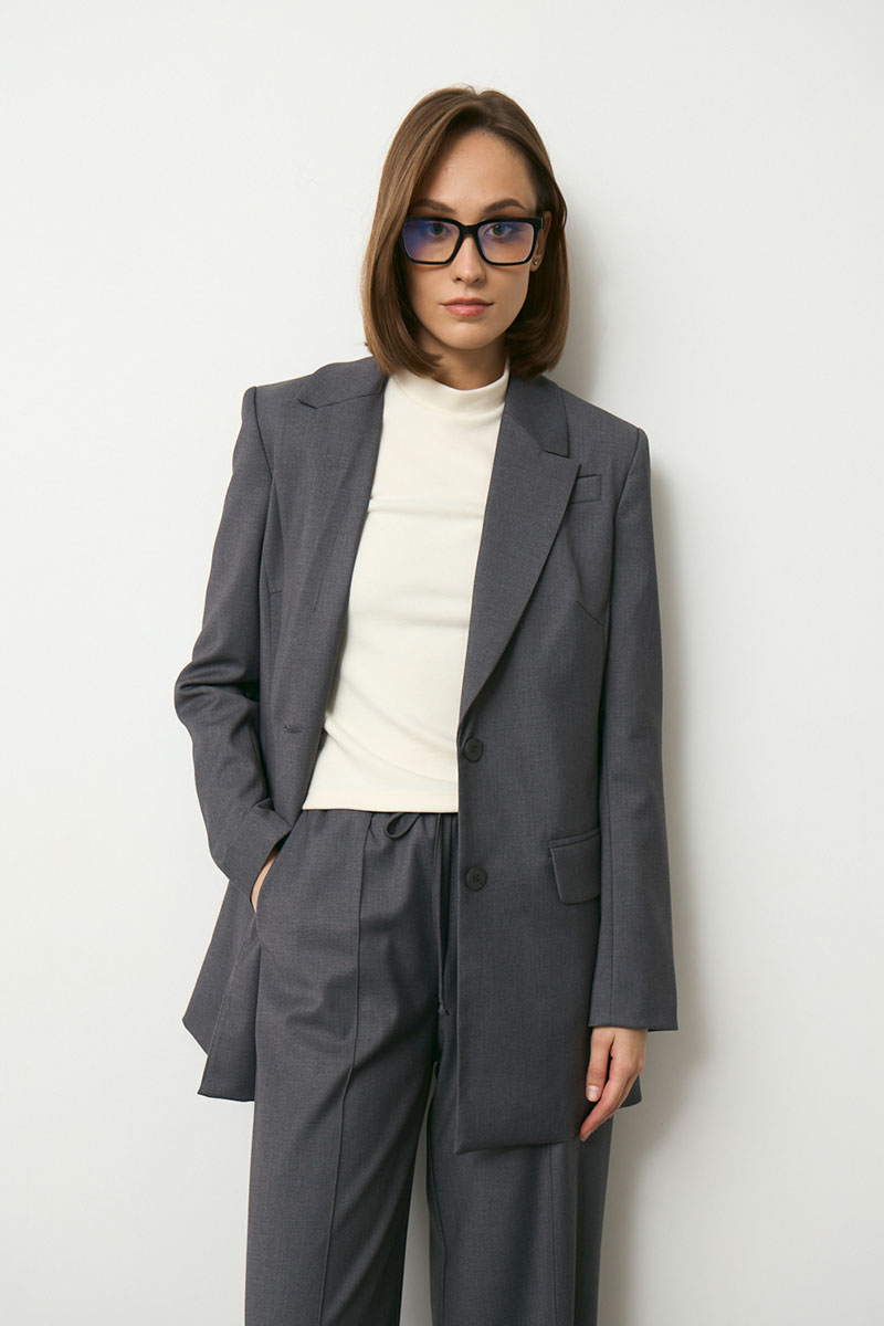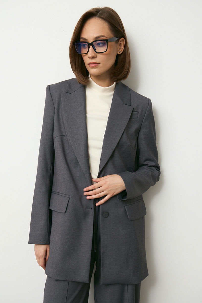 Жакет прямого силуэта, длиной до линии бедер с втачными рукавами до запястья, с воротником пиджачного типа. Застежка центральная на две прорезные петли и пуговицы. На деталях переда обработаны прорезные карманы в рамку с клапанами. На левой детали переда в области лацкана обработан прорезной карман-обманка с листочкой. Спинка с рельефами и средним швом. Изделие на подкладке.