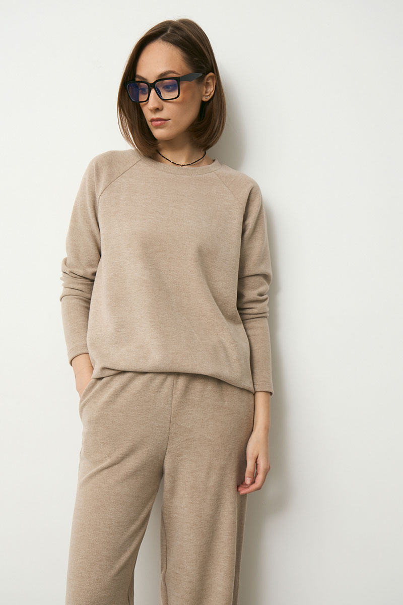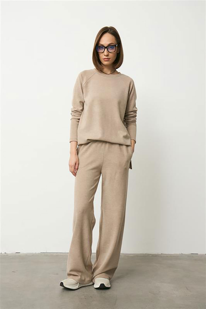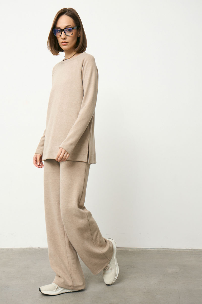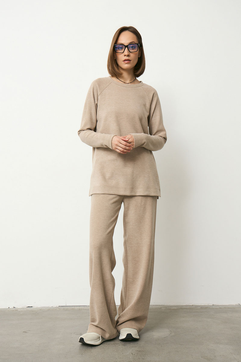 Теплый трикотажный костюм в рубчик, состоящий из джемпера и брюк.