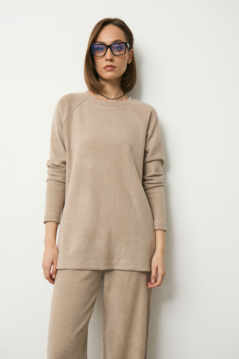 Джемпер прямого силуэта с круглой горловиной и рукавами - реглан. В боковых швах разрезы. Спинка длиннее переда на 2 см по боковому шву.