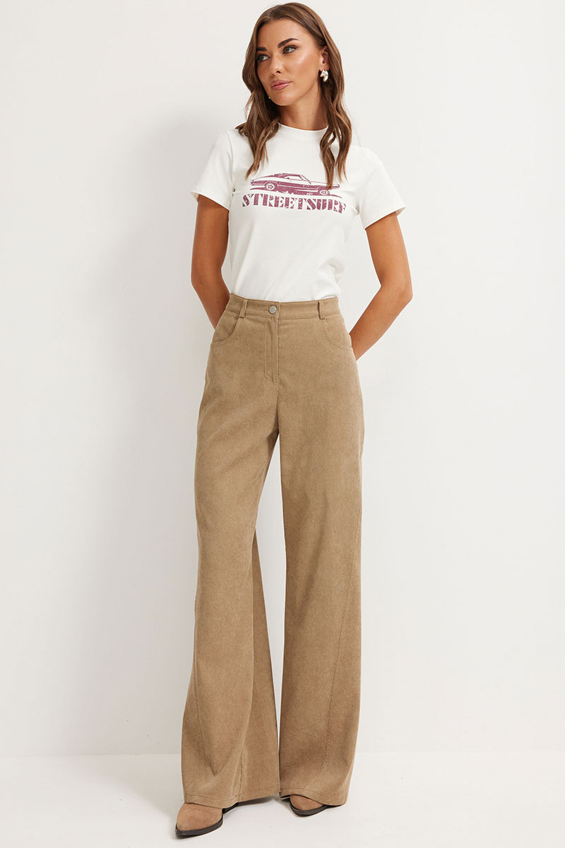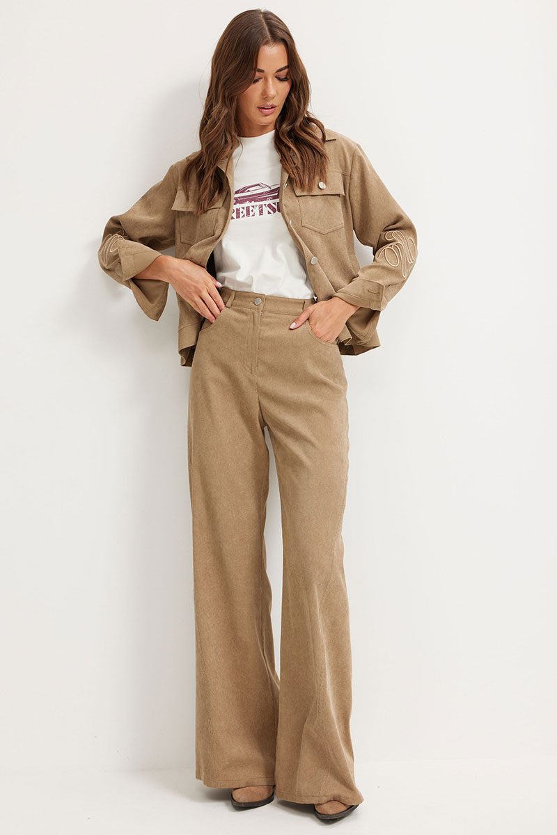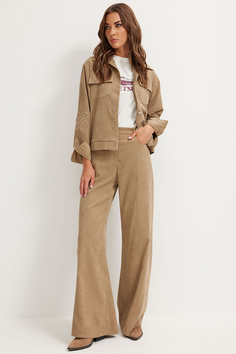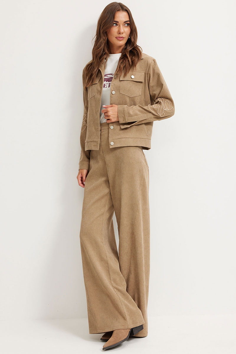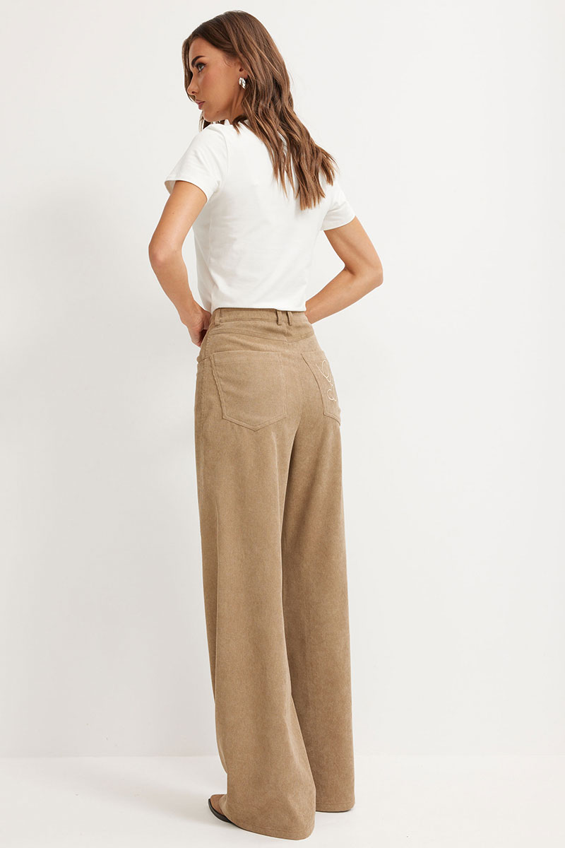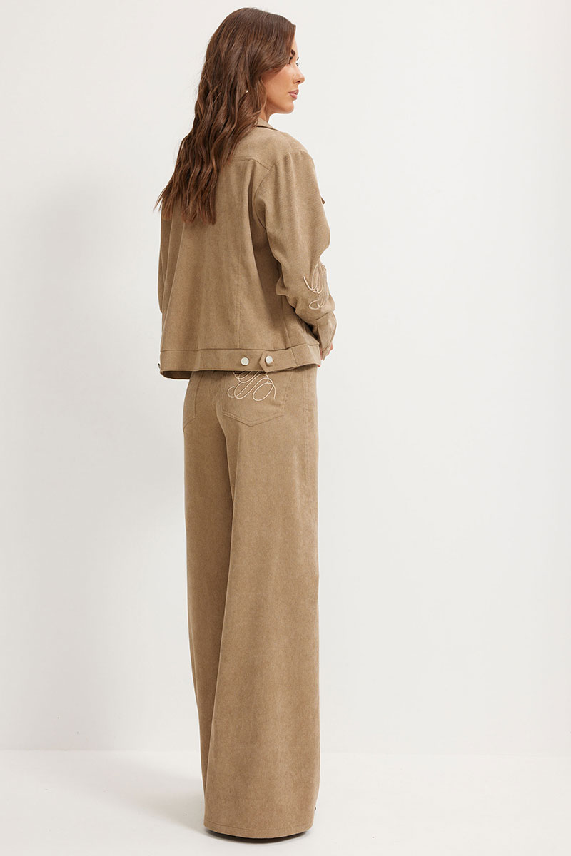 Брюки прямого силуэта расширенные книзу из костюмной ткани. По верху притачной пояс с застежкой на петлю и пуговицу и шлевками для ремня. На передних половинках обработаны карманы и застежка молния в среднем шве. На задних половинках кокетка и накладные карманы. На кармане дизайнерская вышивка. По поясу задних половинок брюк резинка.