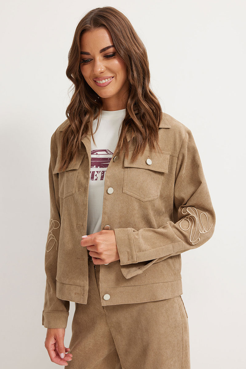 Жакет прямого силуэта из костюмной ткани. Воротник стояче-отложной с центральной застежкой на петли и пуговицы. Рукав втачной длинный по низу манжета с застежкой на петлю и пуговицу. По низу жакета притачной пояс. По переду жакета функциональные карманы с листочкой и накладные карманы с клапаном. На рукавах в районе локтя дизайнерская вышивка. Жакет без подкладки. Обращаем ваше внимание, что фурнитура может отличаться от фото.