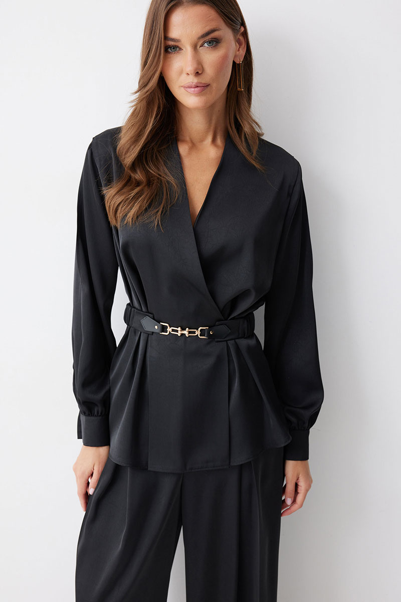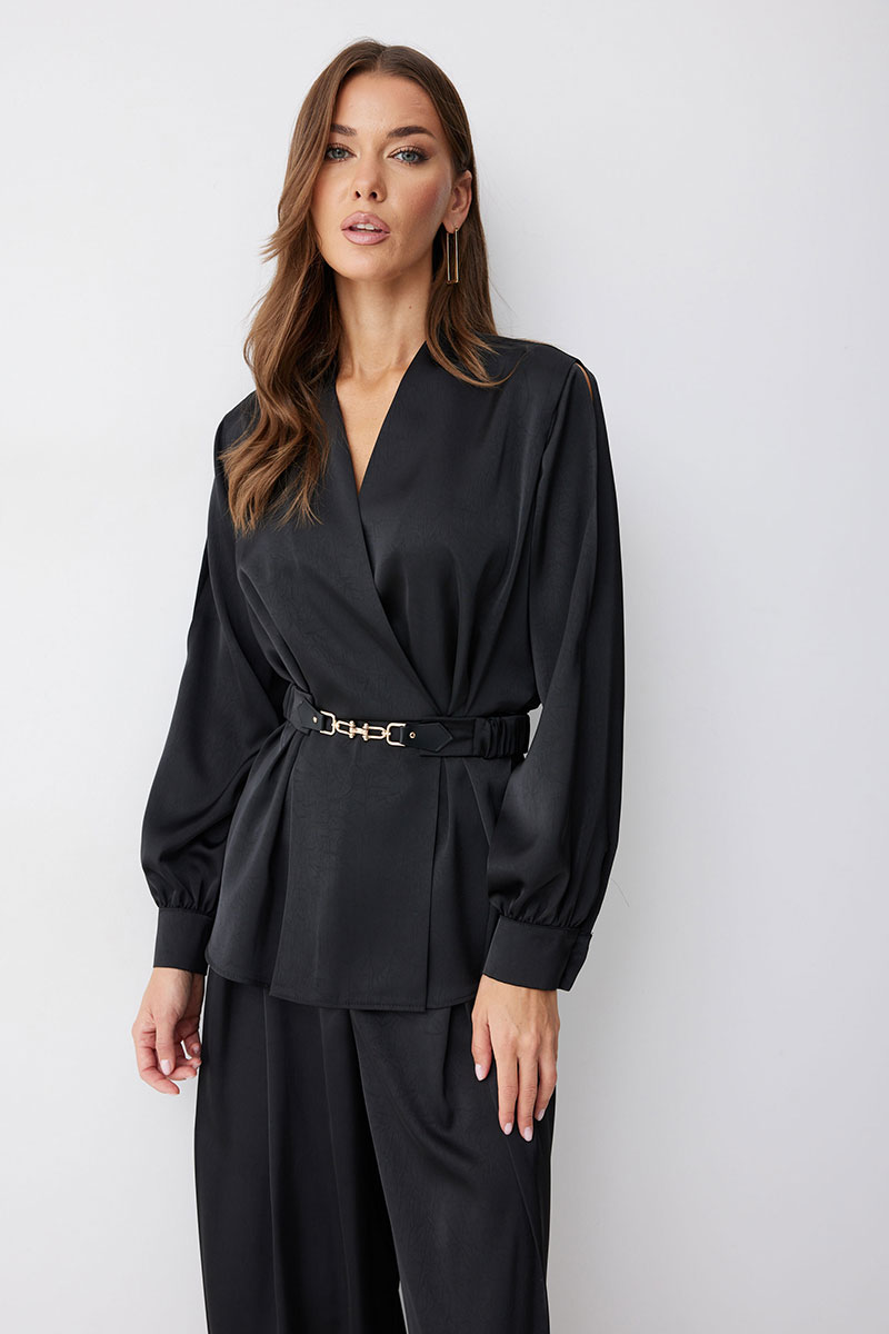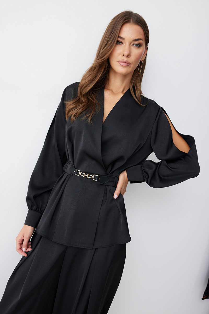 Блузка полуприлегающего силуэта расширенная книзу из струящейся ткани. Рукав втачной, с разрезом в области плеча, по низу манжета с застежкой на петли и пуговицы. Блузка отрезная по линии талии. По переду от подреза вверх и вниз декоративные складки. На спинке в подрез вставлена резинка. В комплект входит съемный ремень. Обращаем ваше внимание, что фурнитура может отличаться от фото.