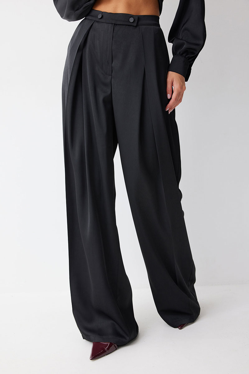 Брюки прямого силуэта расширенные книзу из струящейся ткани. По верху брюк притачной пояс с застежкой на петли и пуговицы. На передних половинках обработана застежка молния в среднем шве. На передних половинках карманы и декоративные складки. По поясу задних половинок брюк резинка и вытачки.