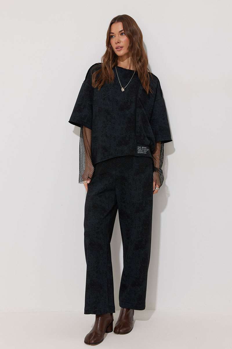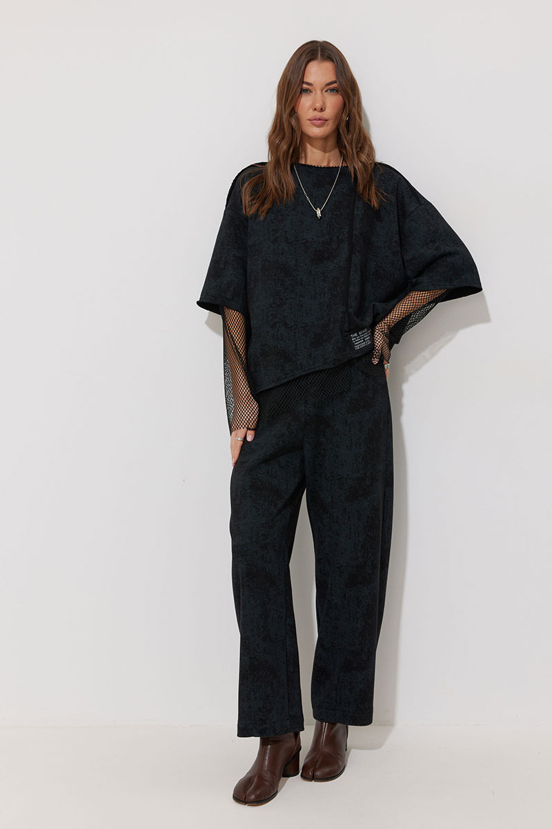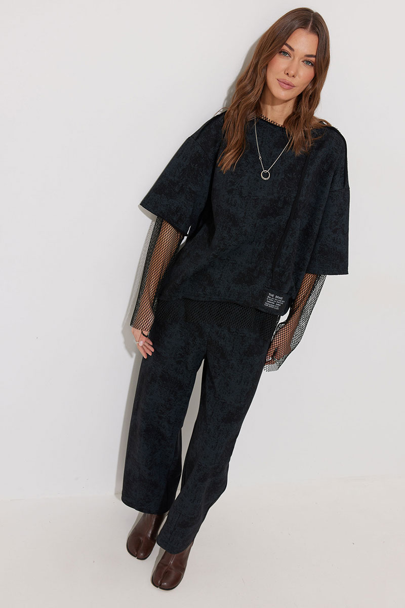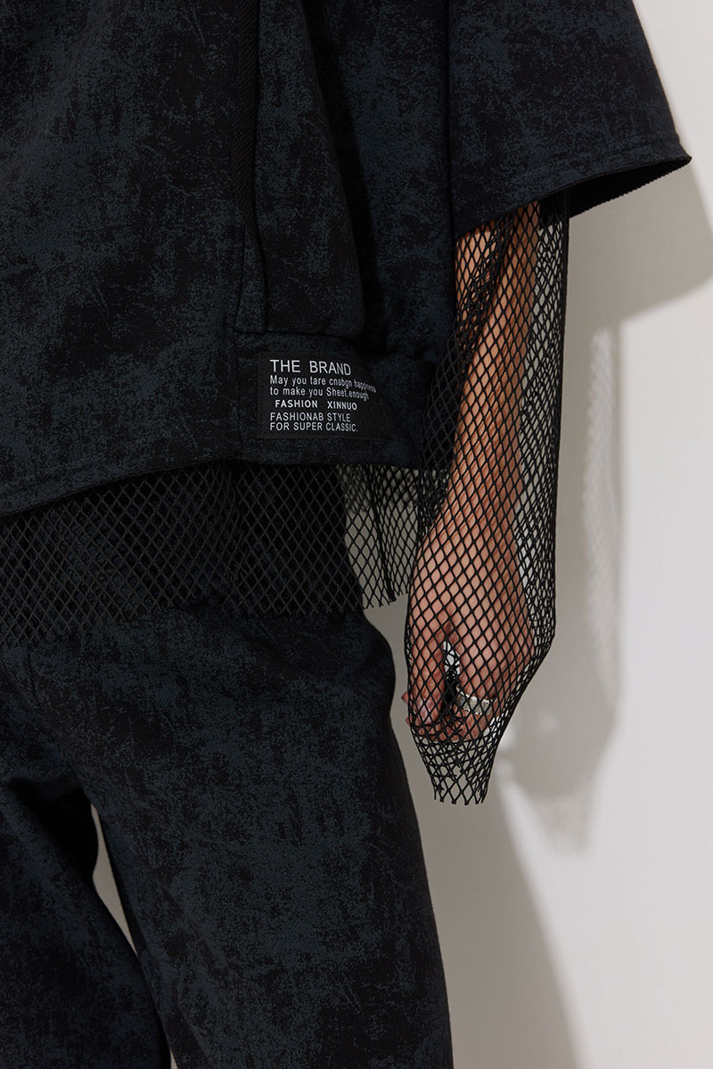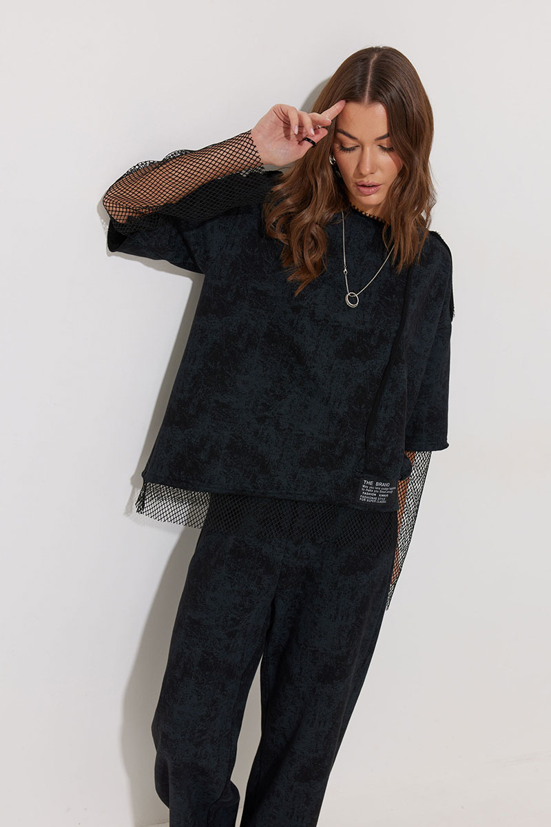 Ассиметричный джемпер прямого силуэта из трикотажного полотна комбинированного сеткой. Горловина округлая. Рукав со спущенной линией плеча двойной. По переду и спинке декоративный шов, по низу пояс с нашивкой . По низу джемпера и рукава декоративная сетка.