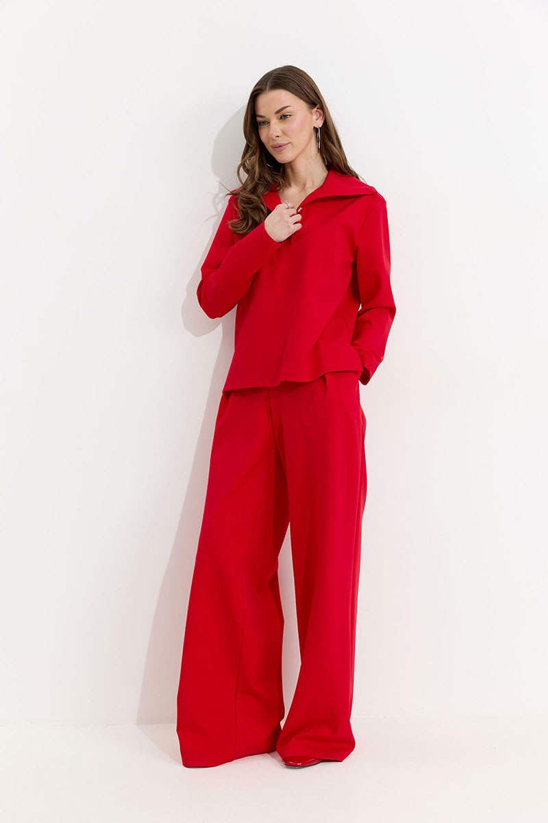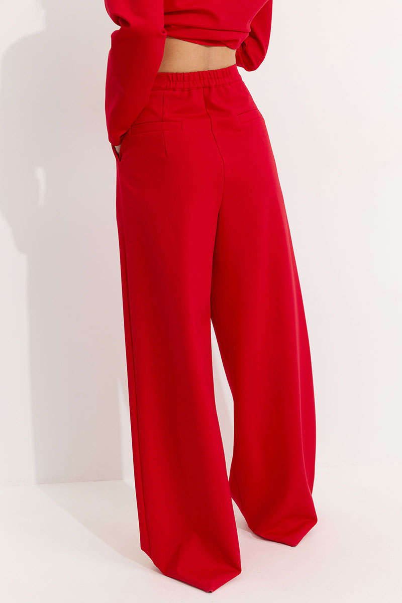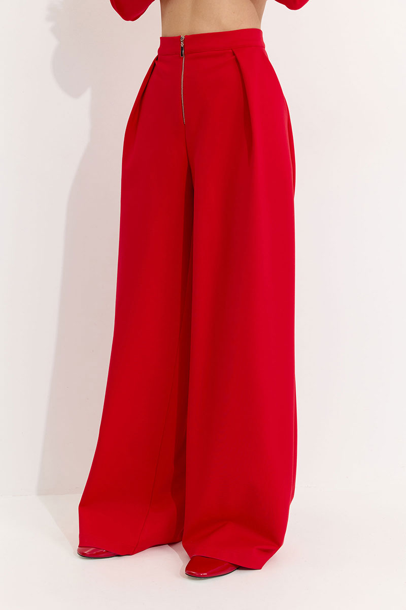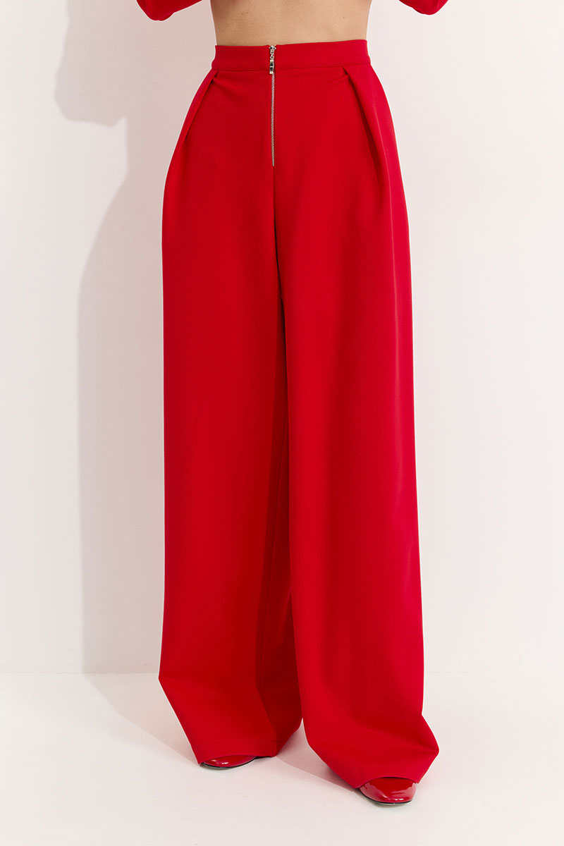 Брюки прямого силуэта из трикотажного полотна. По верху брюк притачной пояс, по переду застежка молния в среднем шве, карманы в боковых швах и декоративные складки. На задних половинках брюк прорезные листочки. По задним половинкам брюк на поясе резинка от вытачки до вытачки.