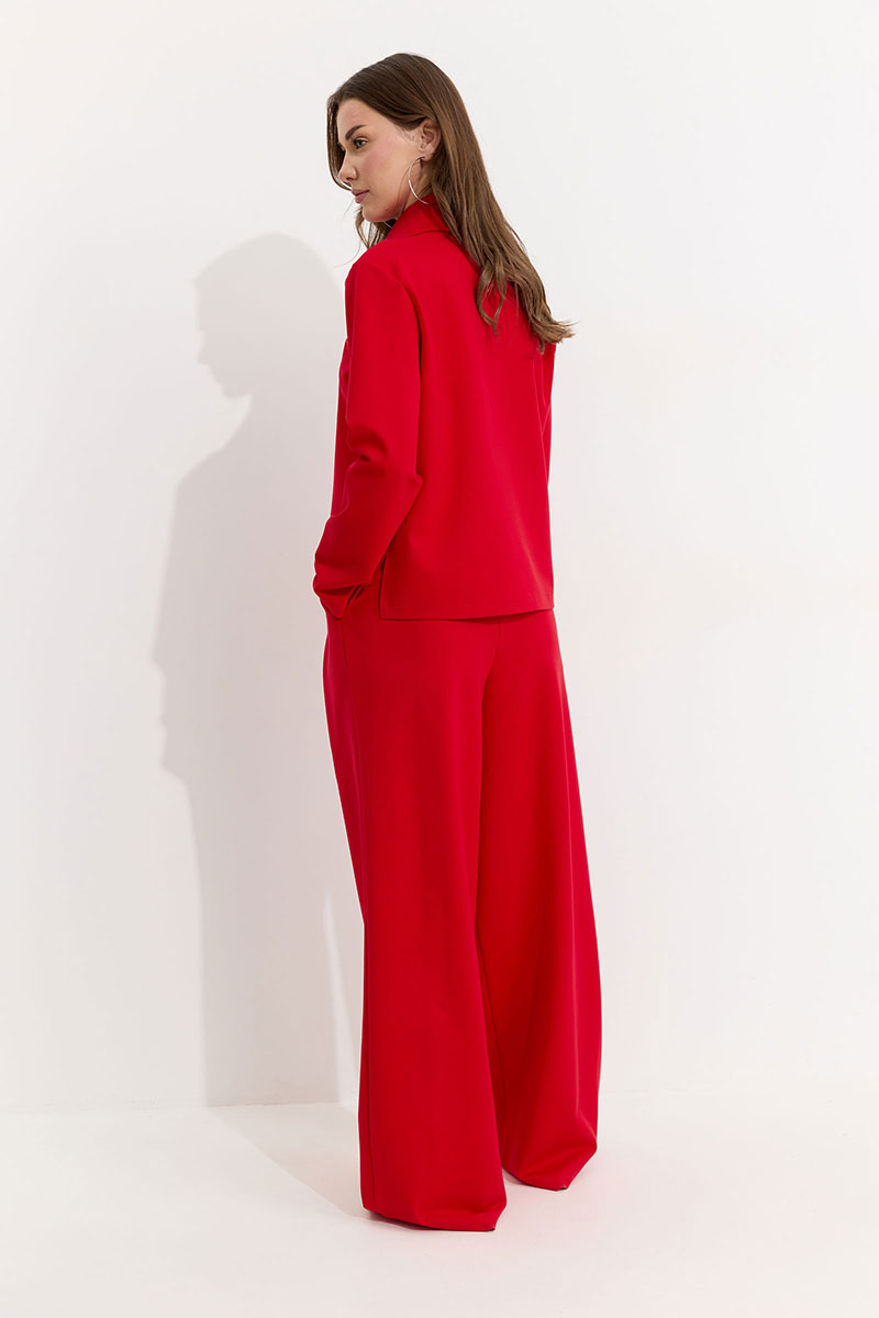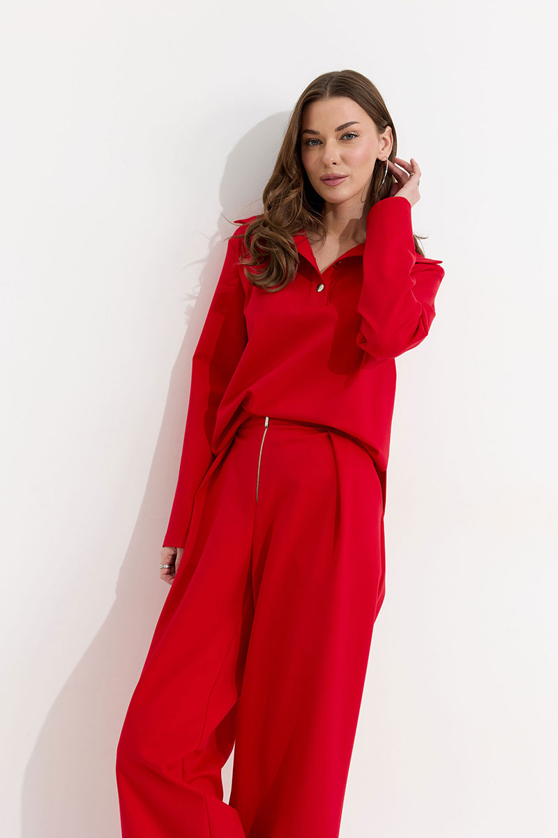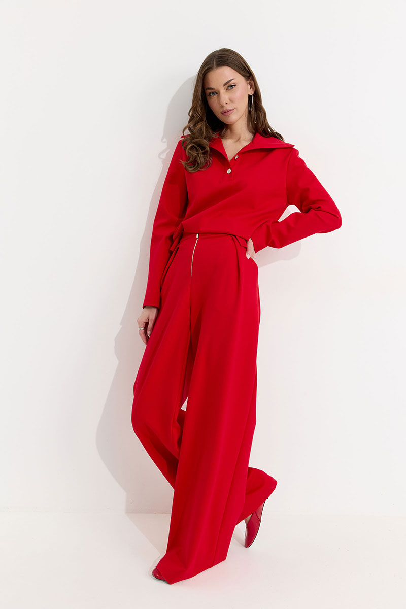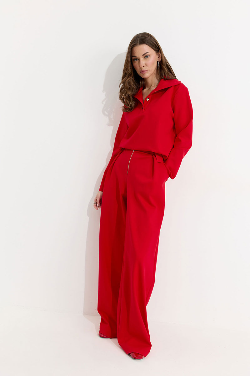 Брюки прямого силуэта из трикотажного полотна. По верху брюк притачной пояс, по переду застежка молния в среднем шве, карманы в боковых швах и декоративные складки. На задних половинках брюк прорезные листочки. По задним половинкам брюк на поясе резинка от вытачки до вытачки.