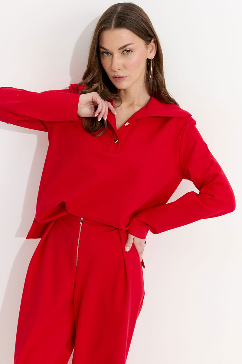 Джемпер прямого силуэта из трикотажного полотна. Воротник - широкая стойка. Горловина с застежкой на петлю и пуговицу. Рукав одношовный втачной, чуть спущена линия плеча. По низу джемпера в боковых швах разрезы.