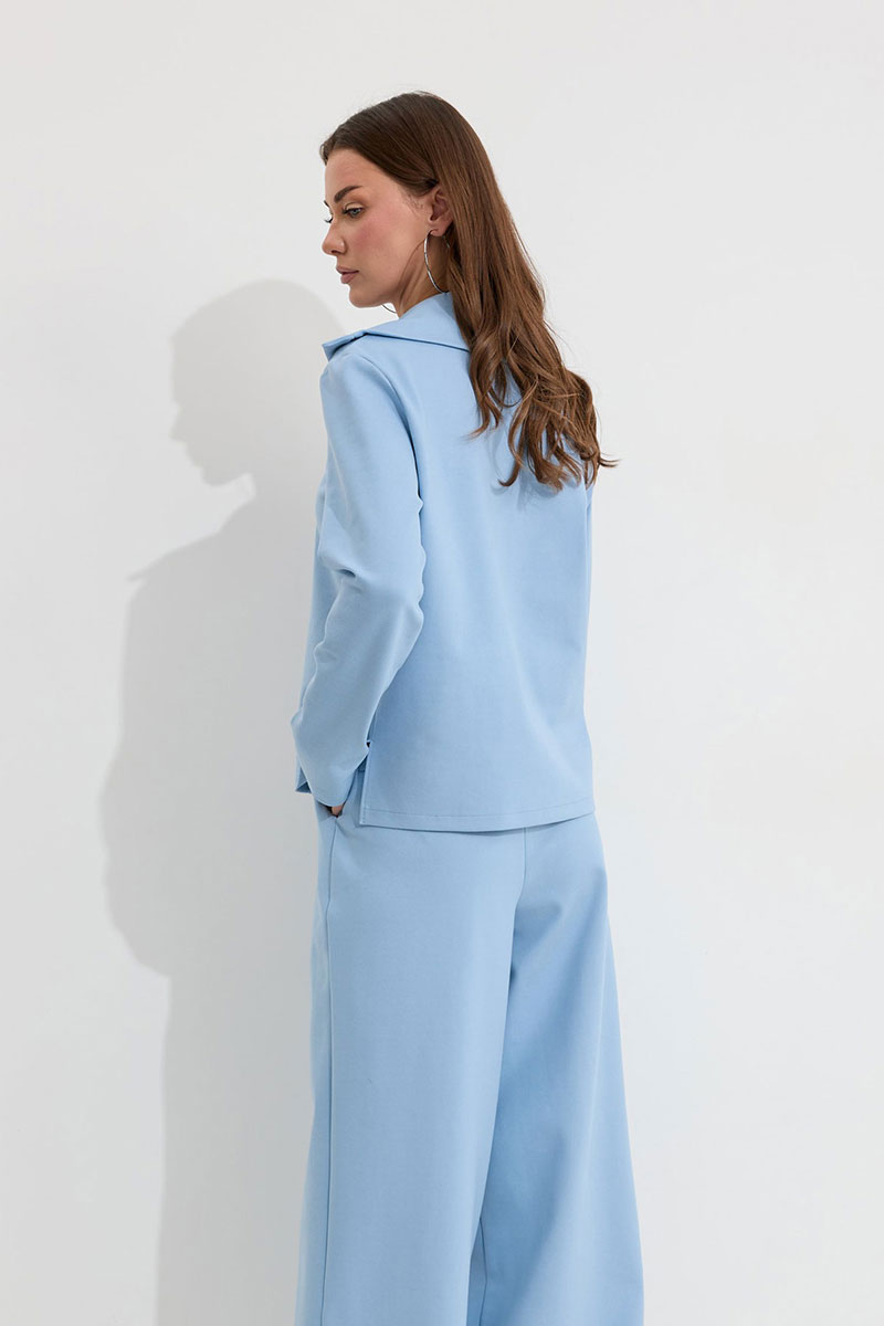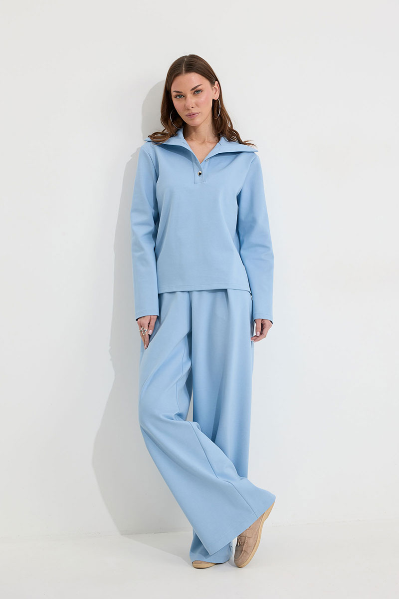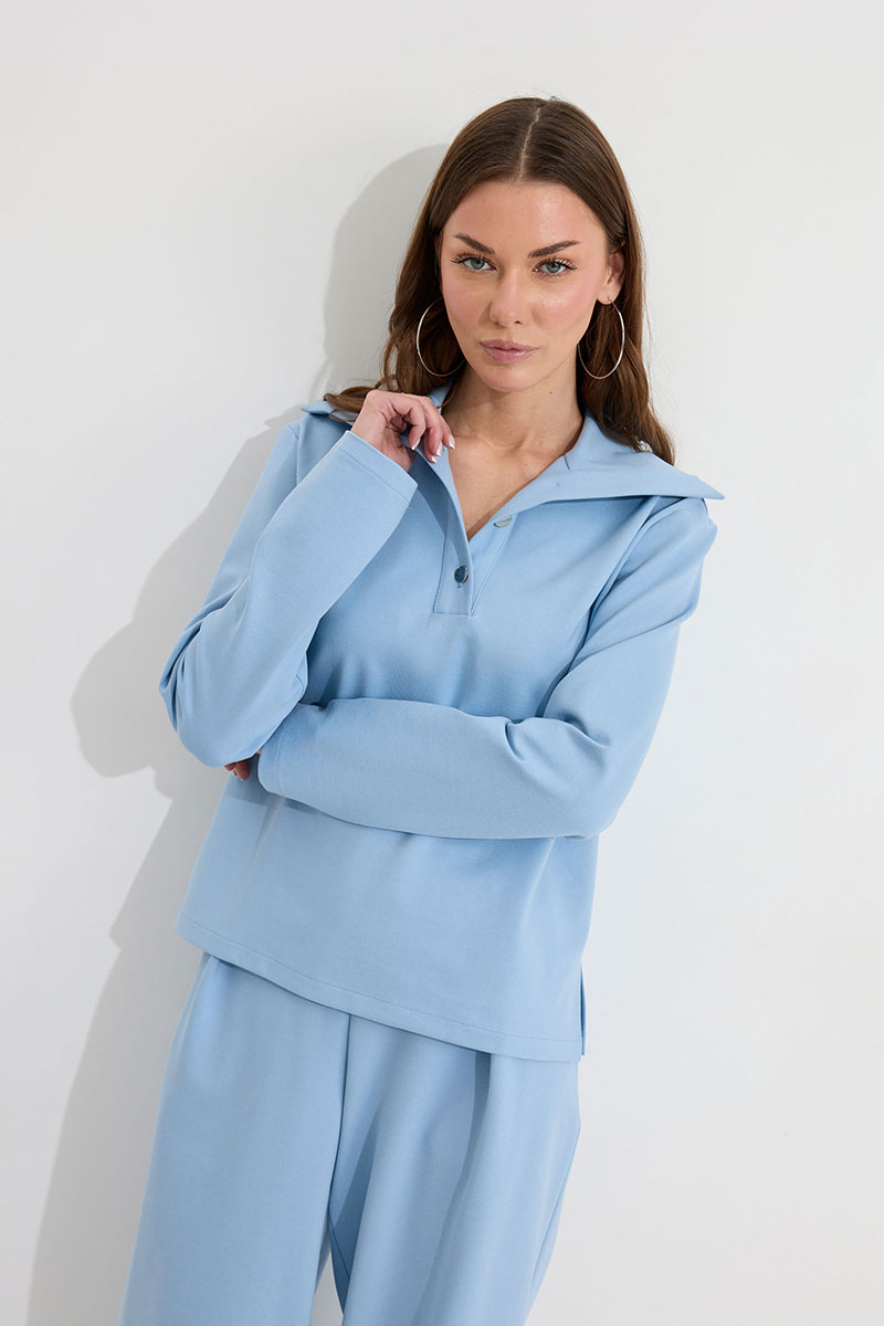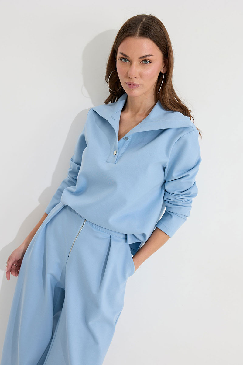 Джемпер прямого силуэта из трикотажного полотна. Воротник - широкая стойка. Горловина с застежкой на петлю и пуговицу. Рукав одношовный втачной, чуть спущена линия плеча. По низу джемпера в боковых швах разрезы.